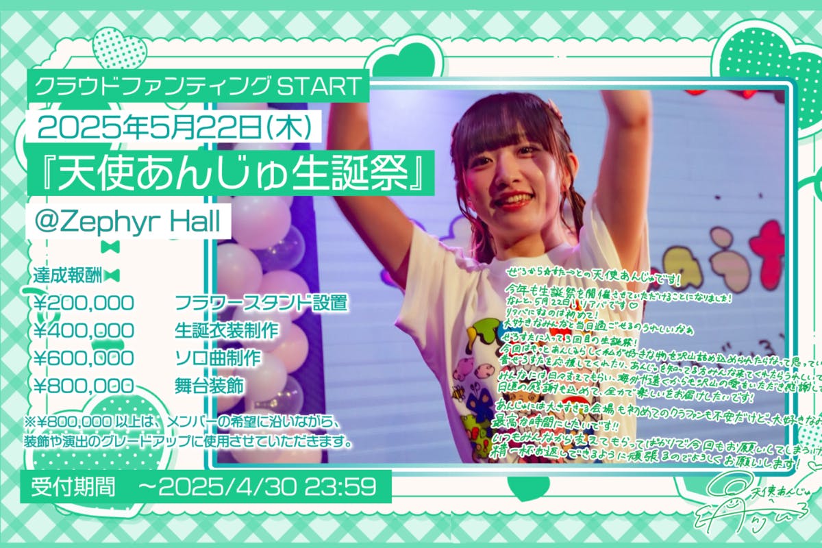 2025年5月22日に名古屋Zephyr Hallで開催されるアイドル「天使あんじゅ」の生誕祭です。今回は、彼女の生誕祭を成功させるために、彼女を応援する全てのファンの力を集結させたいと考えています。