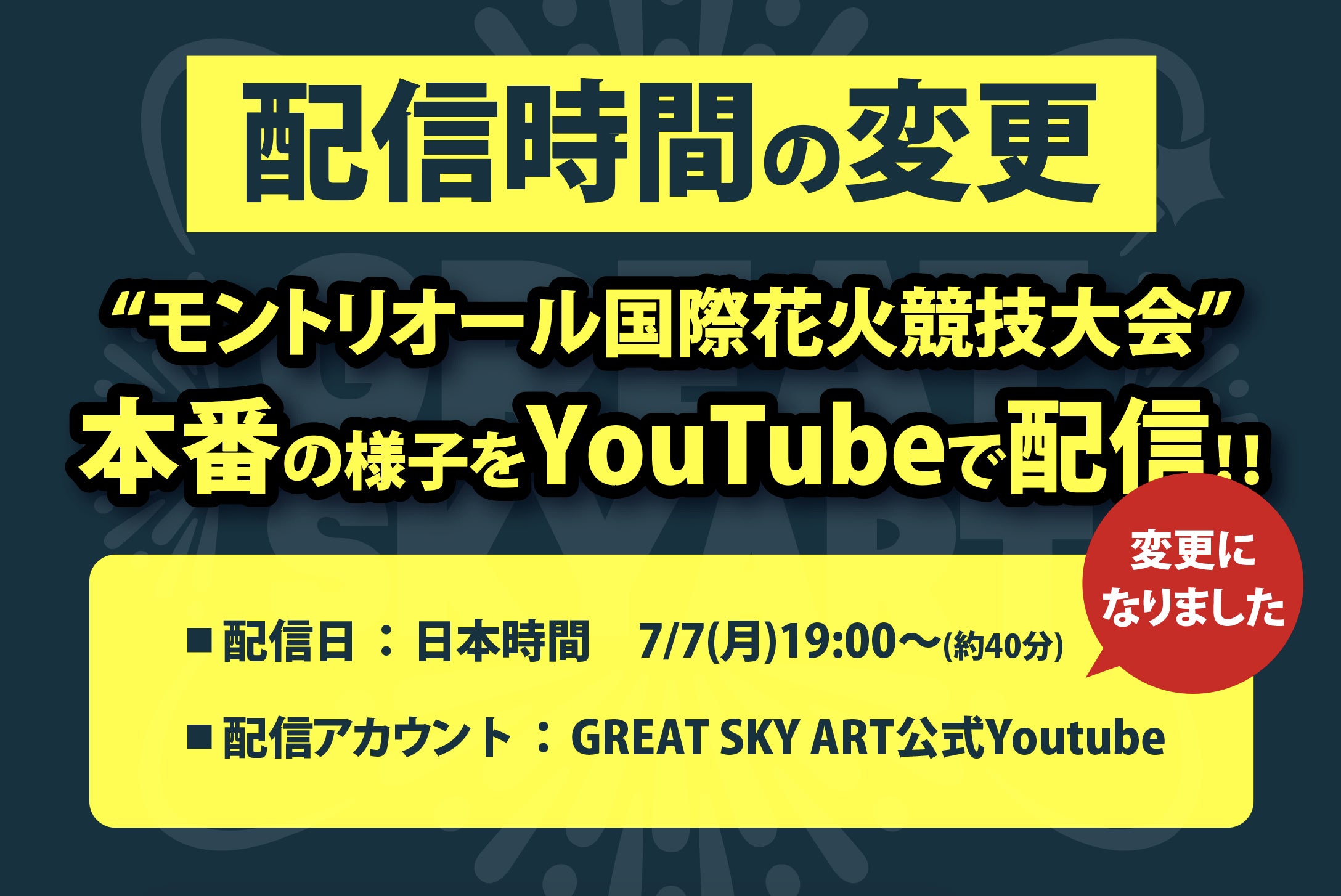 7/7(月)に予定していたモントリオール国際花火競技大会のライブ配信ですが、現地の通信環境が予想以上に不安定なため、録画配信に変更させていただくことになりました。本番の模様は7/7(月)19:00〜(日本時間)GREAT SKY ART公式YouTubeより配信予定楽しみにしてくださっていた皆さまには申し訳ありませんが、より高画質・高音質でお届けするための判断です。ぜひ月曜夜、ゆっくりご覧くださいチャンネル登録はこちら▼ https://www.youtube.com/@greatskyart6952