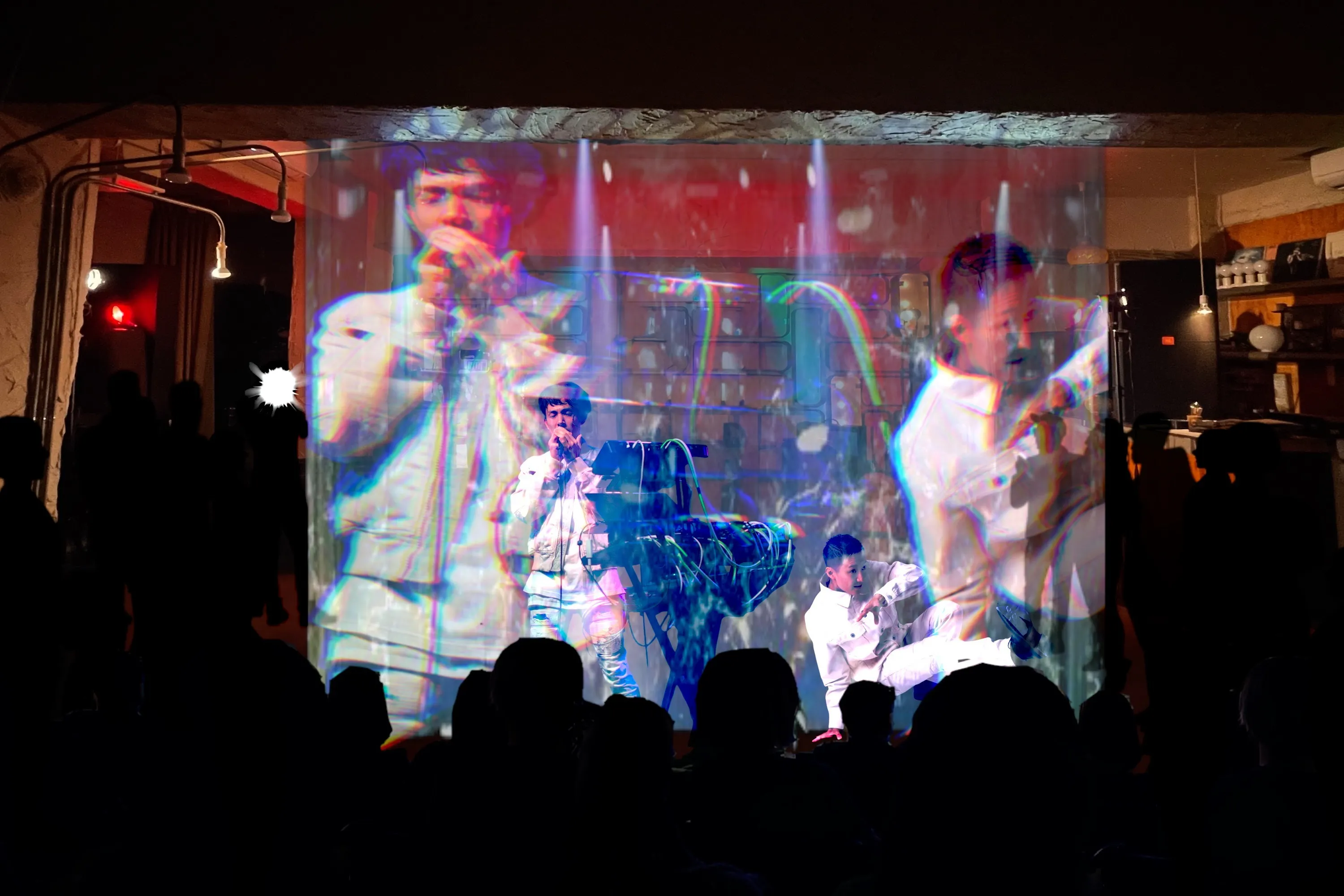 (※こちらの動画、写真は実際の公演のイメージ。演奏家、パフォーマーが観客の目の前で躍動し、その瞬間を切り取った写真がリアルタイムに紗幕スクリーンに投影されます。)