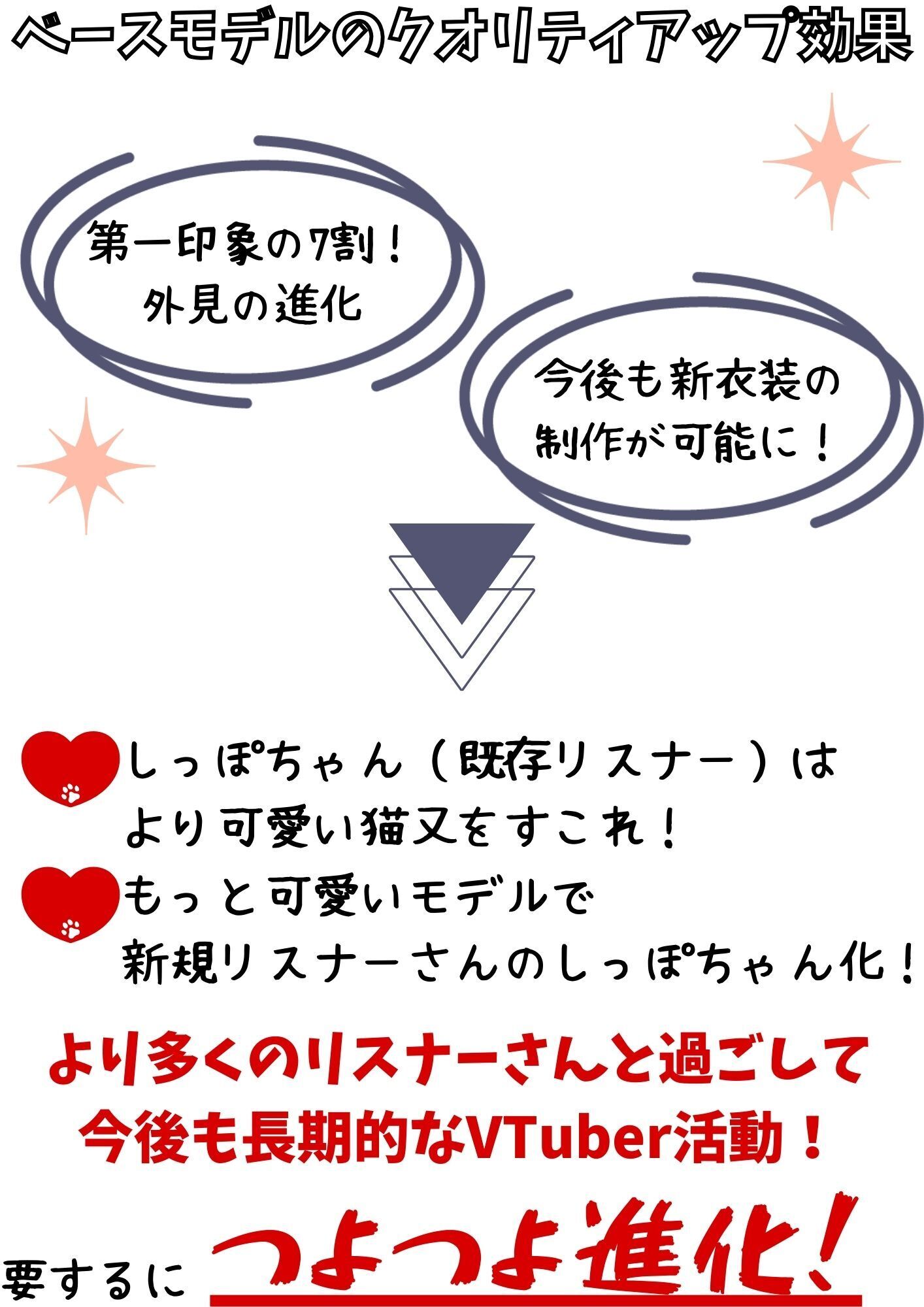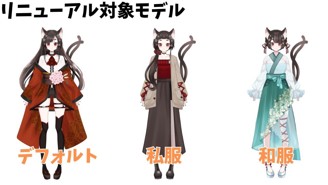 ベースモデルのクオリティアップにより、今後も安定した新衣装の実装が行えるようになるとともに、第一印象の7割を占めるといわれる外見のレベルがあがり、より多くの方の目に留まりより多くの方と一緒に楽しい時間を過ごせるVTuberとして活動を続けていきます。