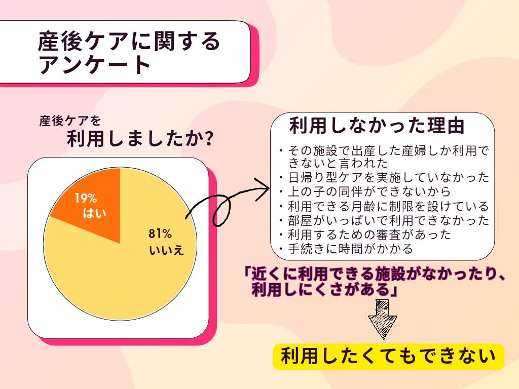 利用しなかった理由や利用できなかった理由として、その施設で出産した人に限定されていたり、産後4か月までの母子の利用に制限されている施設が多く、受け皿が不十分ということが大きく挙げられます。