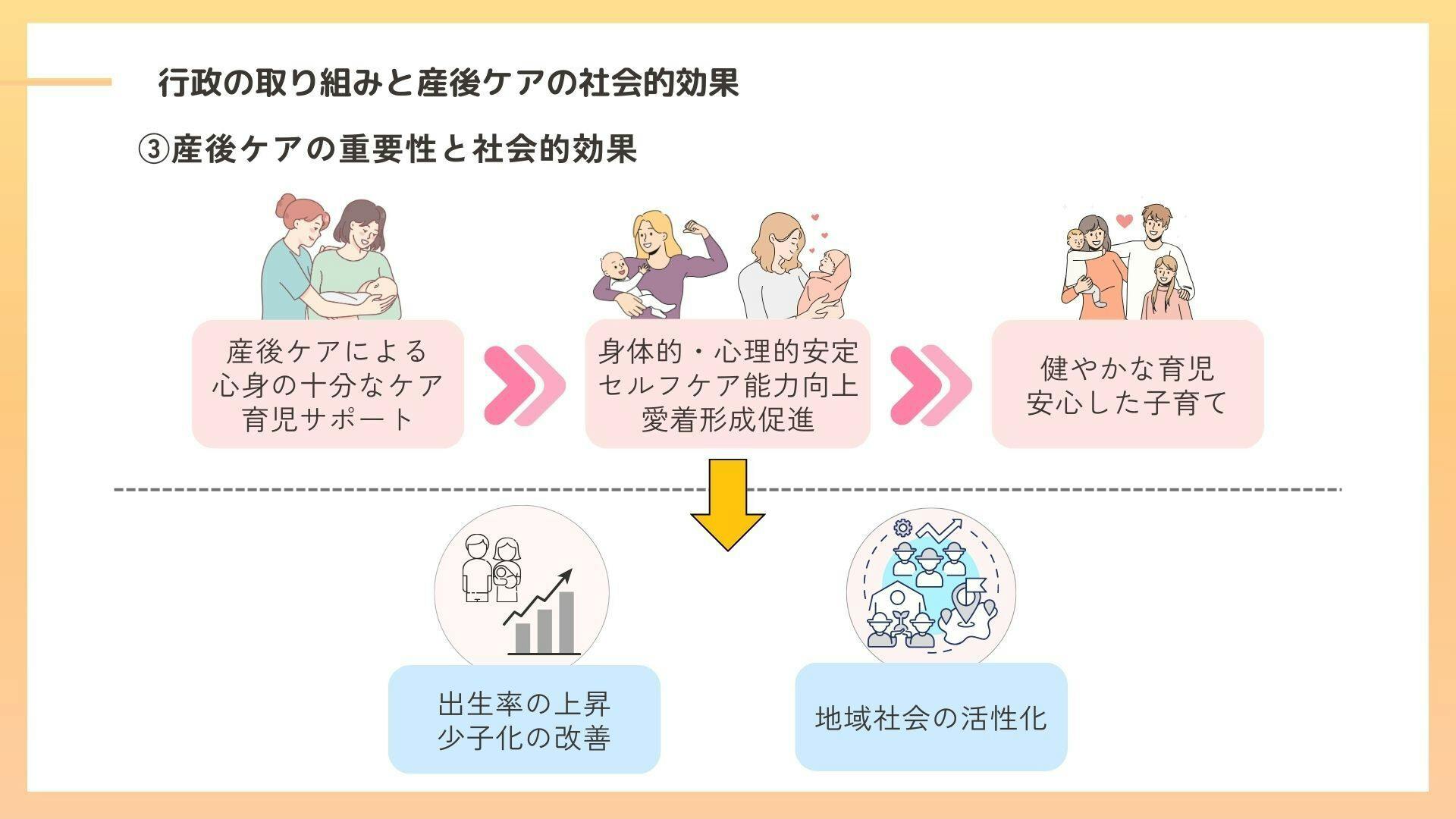 そのような中、安心して子ど もを産み育てることのできる環境や地域社会のしくみが求 められており、その一つに挙げられるのが産後ケアです。
