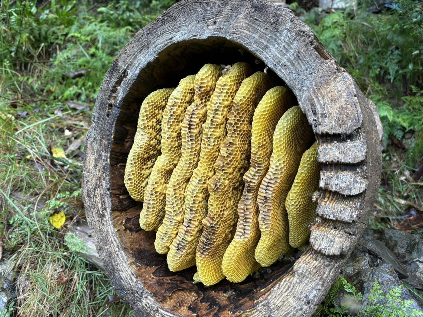 実際に山江村まで行き、養蜂場を見せていただいたのですが、山の中のリアルな自然環境のなかでニホンミツバチが巣を作っていました。とくに驚いたのは、巣箱の形。巣箱といえば、人間が作った四角の形と思っていたのですが、山江村では「丸洞式巣箱」といって、木をくり抜いて巣箱を作っていたのです。