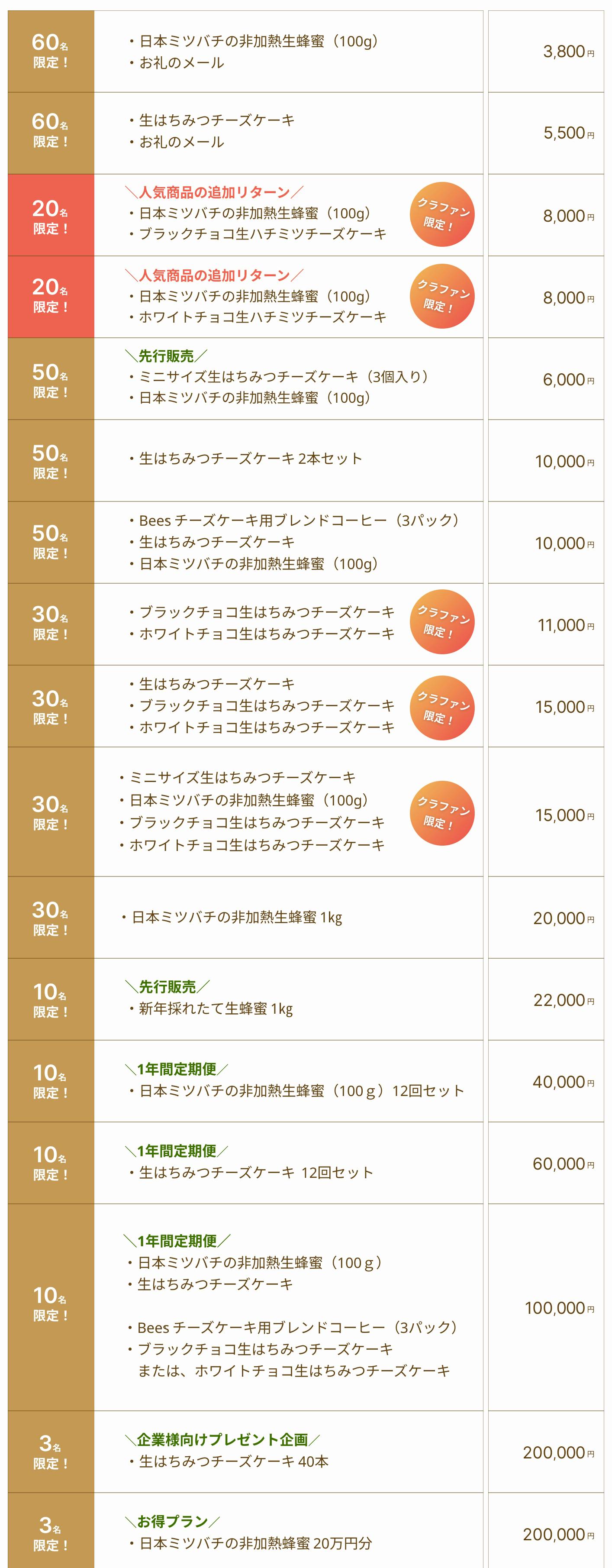 今回は、好評をいただいている「生はちみつチーズケーキ」ほか、クラウドファンディング限定の商品もご用意しました。今まで以上に多くの方へ、Bee'sの生はちみつチーズケーキで笑顔になれる瞬間をお届けしたいと思っています。