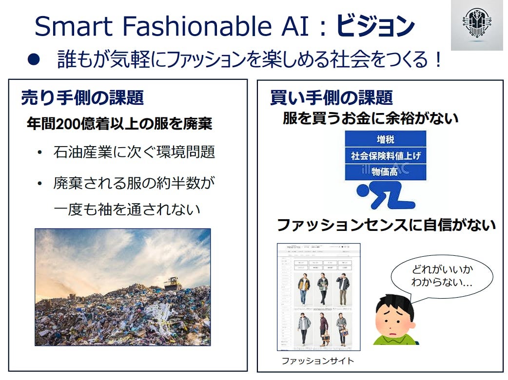 現在、年間200億着以上もの服が廃棄され、その約半数は一度も袖を通されないままです。一方で、服選びに悩みを抱える人々が多く、特に経済的理由やファッションへの自信のなさから十分におしゃれを楽しめない人もいます。この問題を解決し、ファッションと環境を両立させたいという思いから、このプロジェクトを立ち上げました。