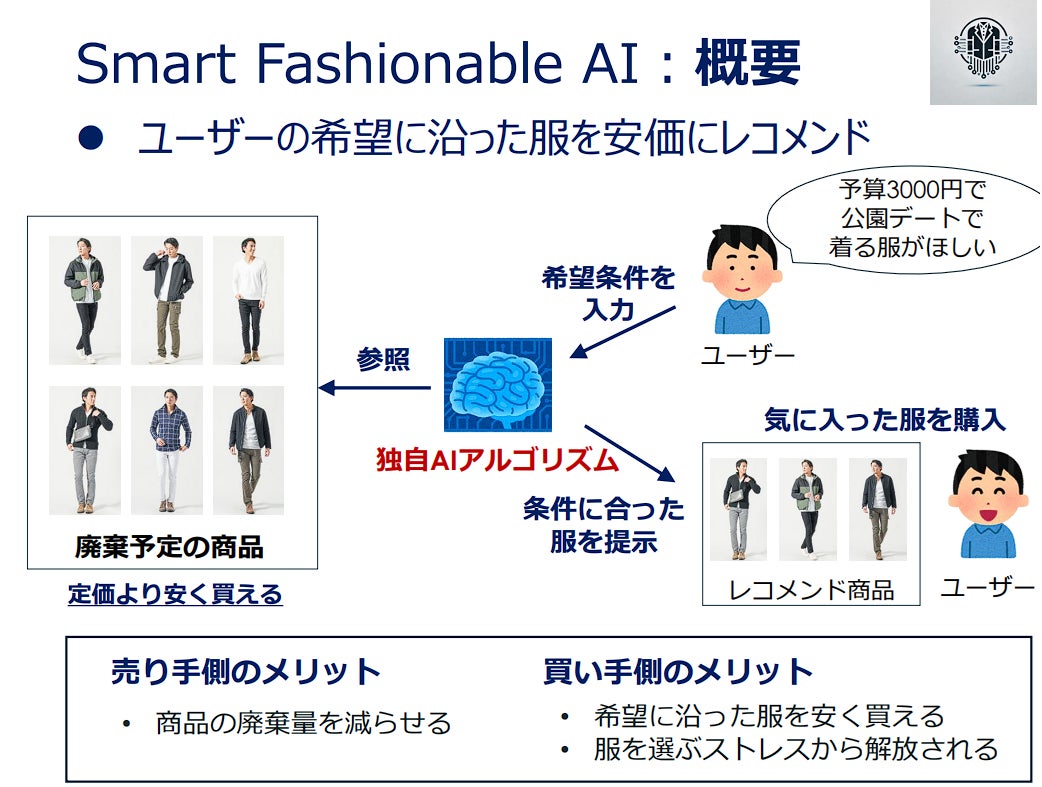 AIを活用し、服選びのストレスをなくし、廃棄予定の服をリーズナブルな価格で提供します。環境負荷を軽減しつつ、誰もがおしゃれを気軽に楽しめる社会を目指しています。