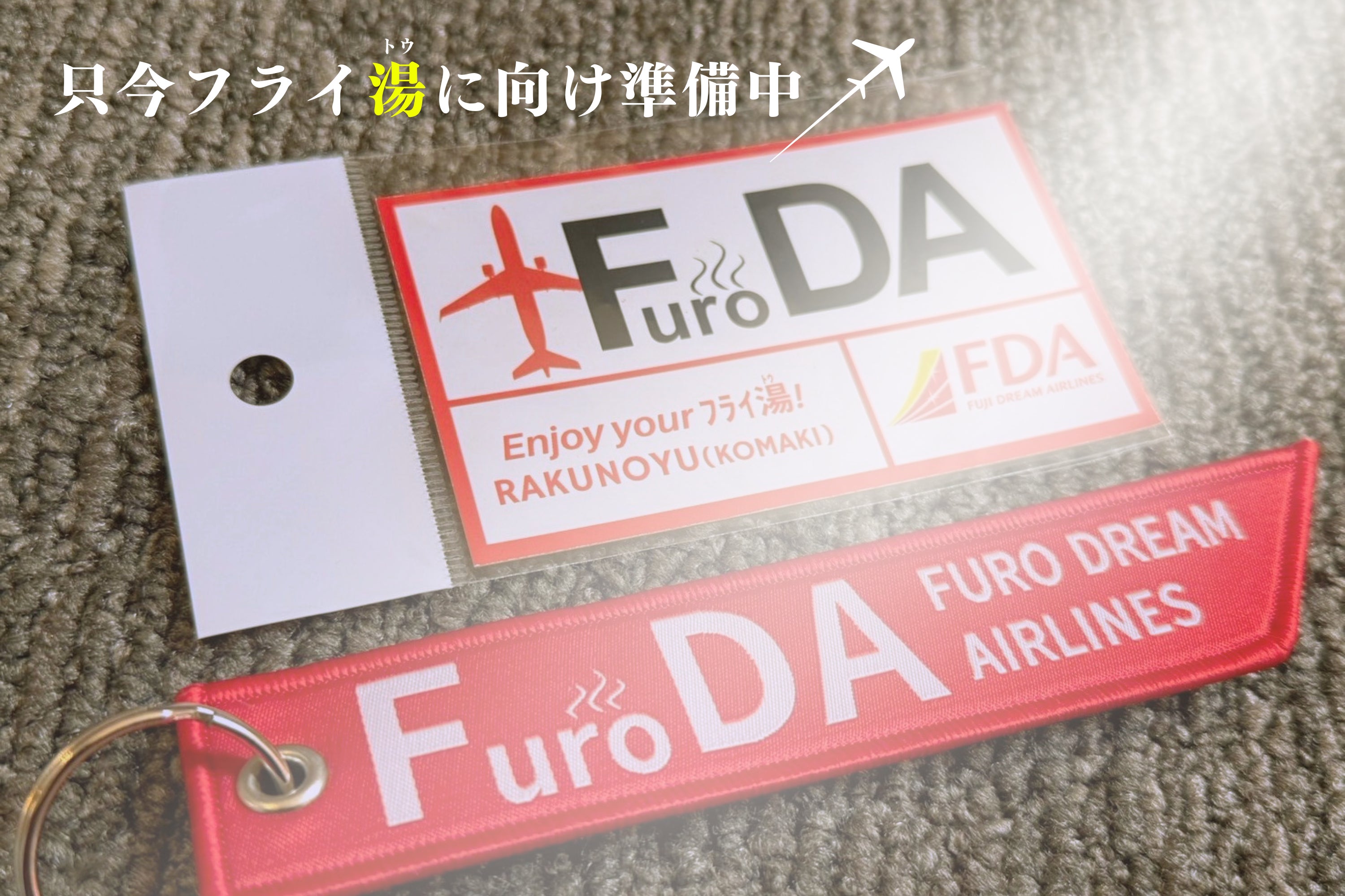 クラファンリターンの、「FuroDA(フロディーエー)ステッカー」と「フライ湯(トウ)タグ キーホルダー」が届きました✈