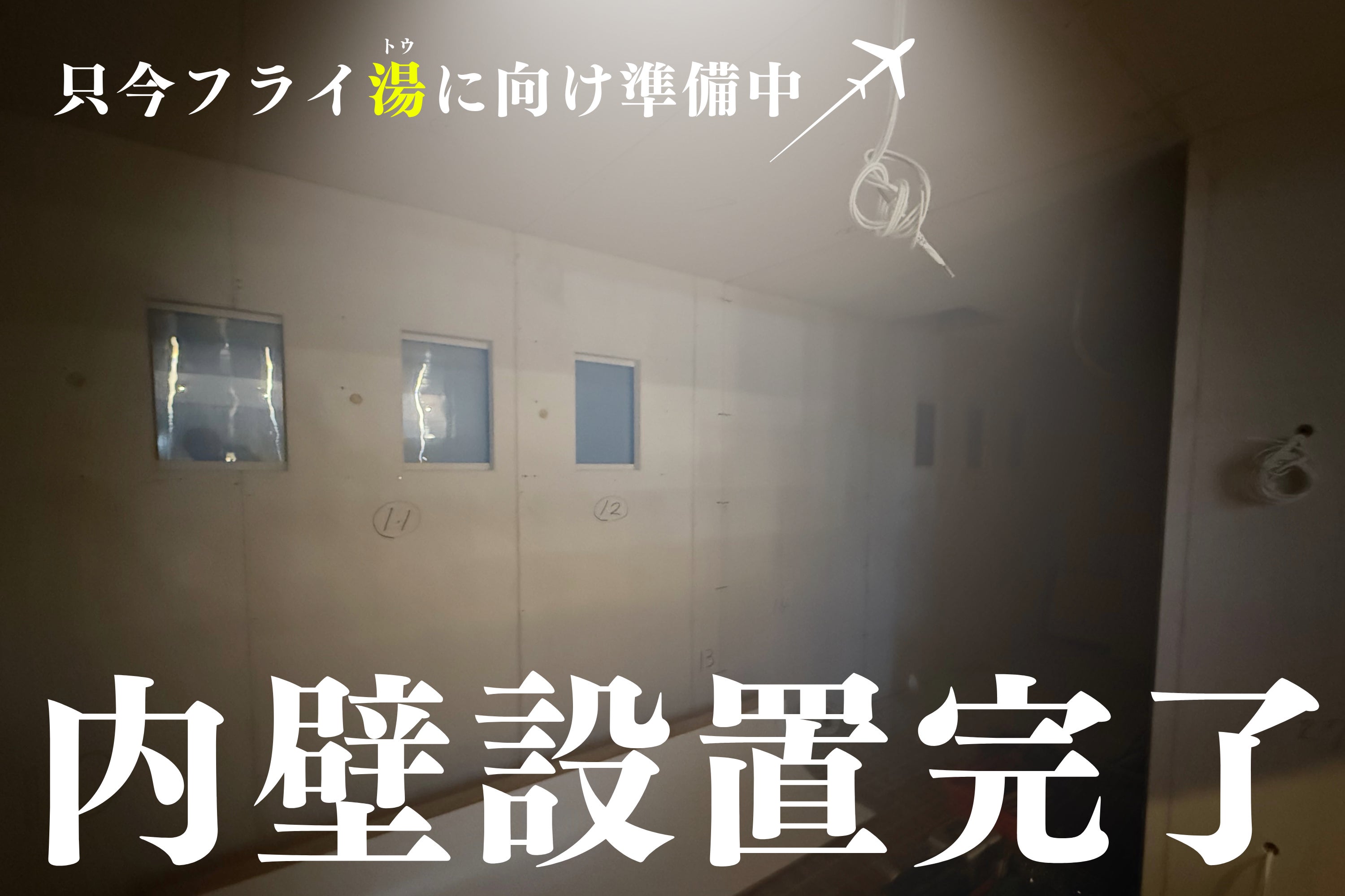 サウナ室の壁にずらりと並ぶ小窓、そして天井からは“酸素マスク…ではなく配線”がぶら〜んと待機中。まるで機内の雰囲気をそのまま再現したような空間が、少しずつ姿を現してきました!