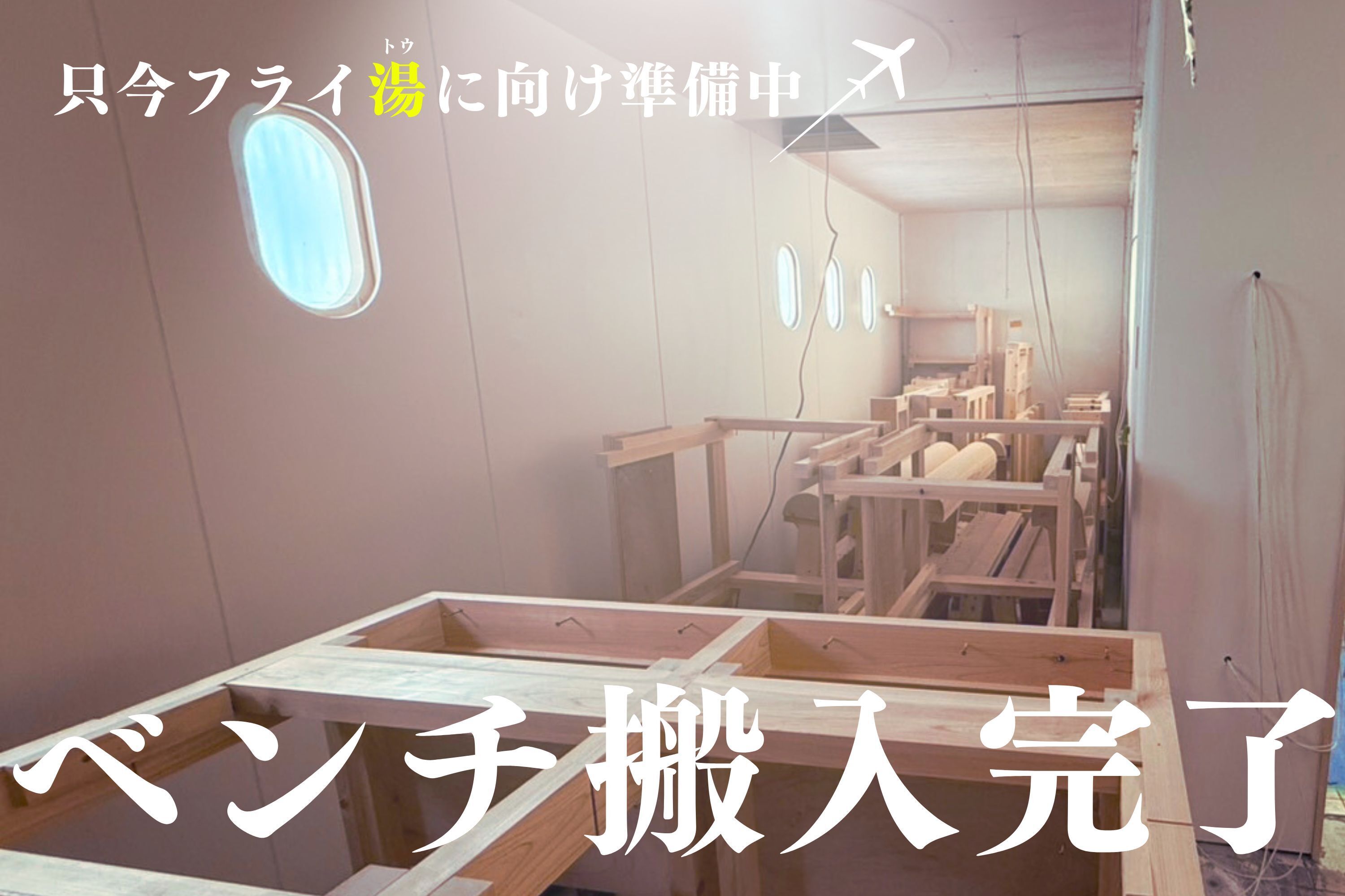 そして本日、飛行機サウナに“ベンチ”が搬入されました✈組まれた木枠がサウナ室に並び、少しずつ「機内らしさ」が濃くなってきています。