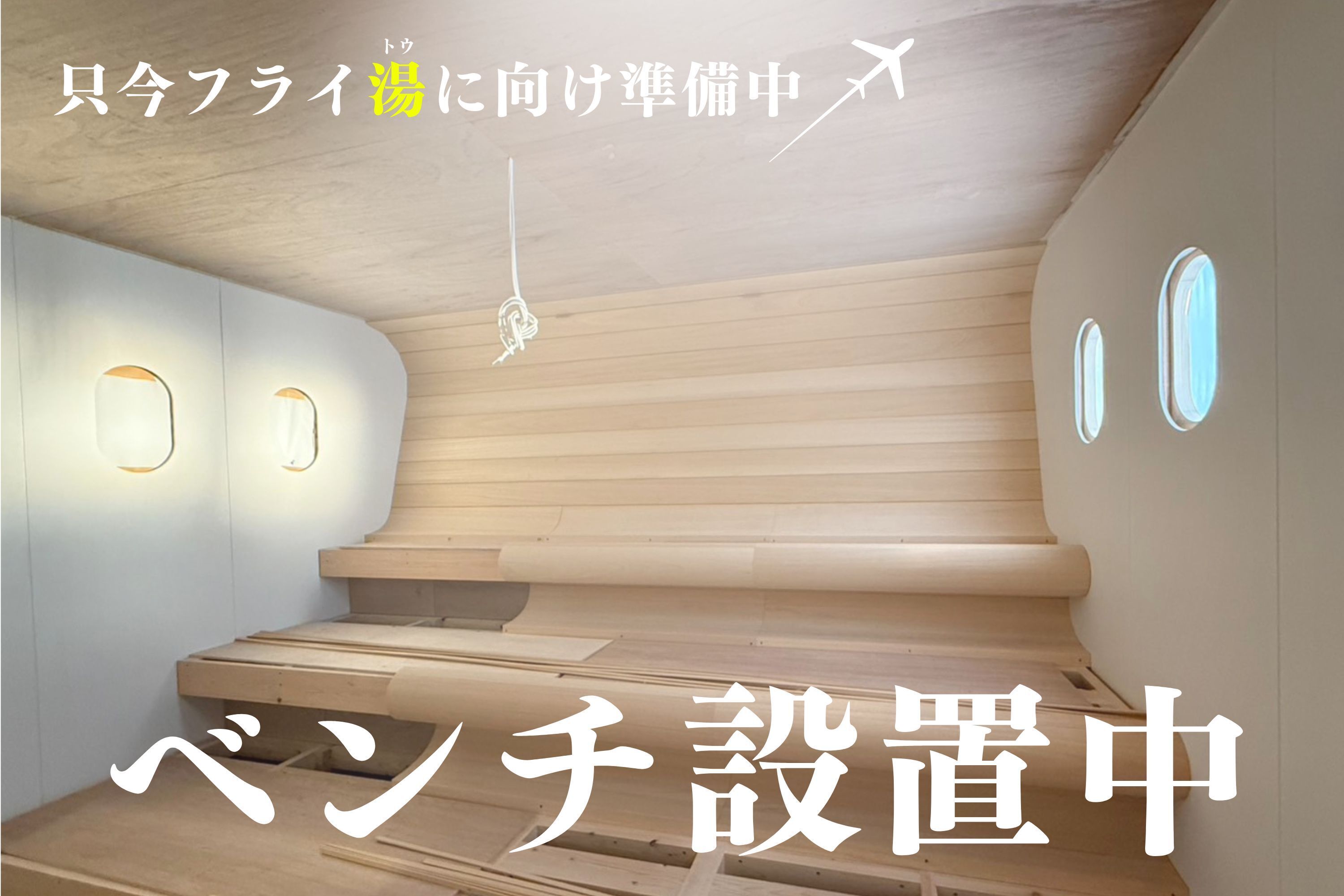 機内をイメージした飛行機サウナ、その“心臓部”ともいえるサウナベンチの設置が現在進行中です。曲線を描くベンチや丸窓が並ぶ空間は、まさにサウナで“空の旅”を楽しめるような仕上がりへと近づいています。