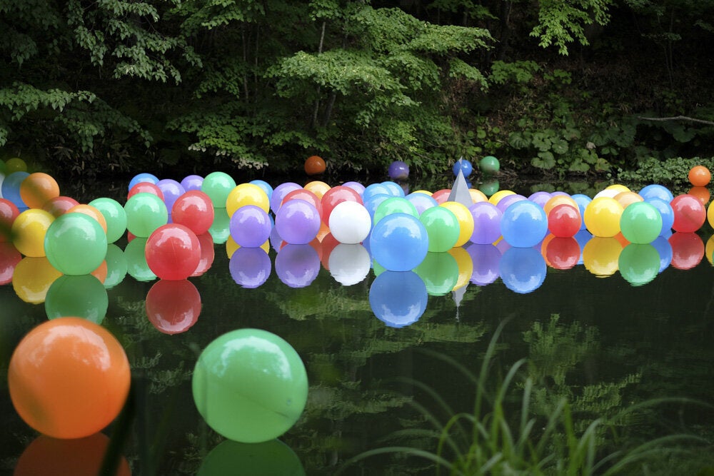レインボーマーチが一旦終わりましたが、多くの素敵な仲間たちで再び復活、私自身も制作を再開した2018年に、紅桜公園での野外展に出品したのが「公平中立」という作品で、池に設置した中立を象徴するブイと、約200個のレインボーカラーのビーチボールで、それぞれの色の意味をレインボーマーチの皆さんに教えていただき、全体として多様性を象徴しますが、ボールに付けた錘が微妙に違うので、池の中をそれぞれが動いて、中立のブイも動くような仕掛けになっていいて、自然の中で社会も感じていただくような作品でした。そしてその年のパレードの集会で、その使用後のレインボーボールをあちこちに配置して使っていただいたことも光栄に思っています。
