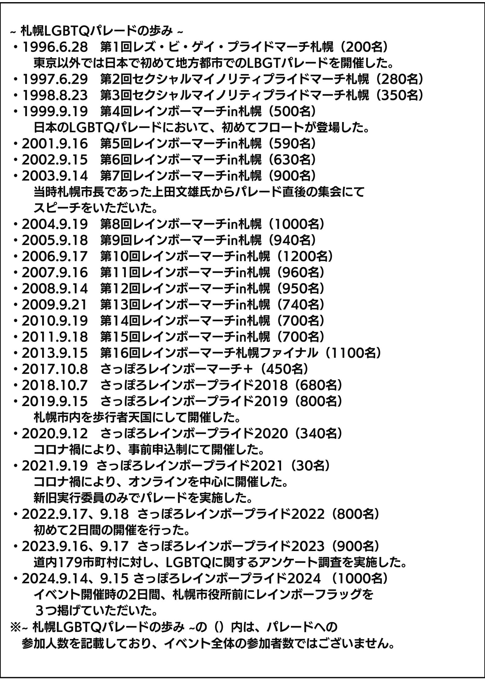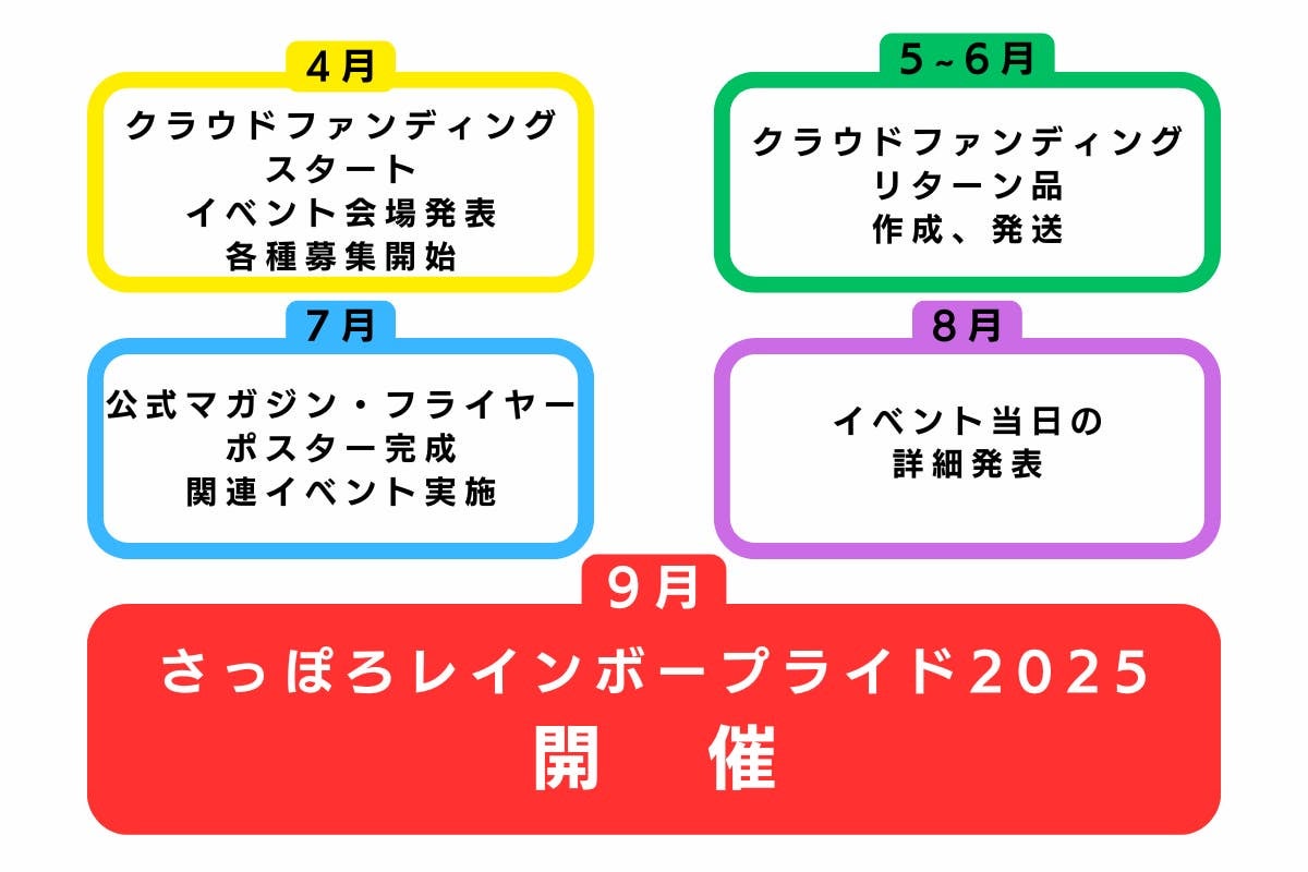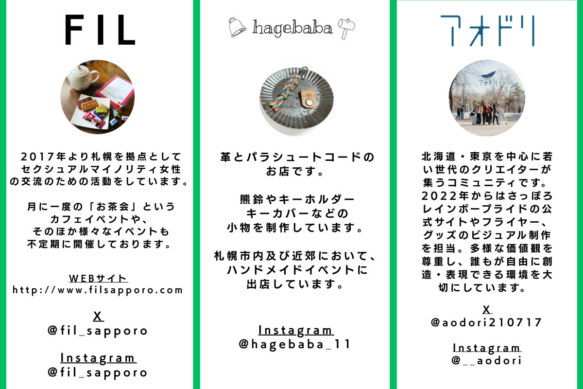 ※悪天候、地震、伝染病等の不測な事態によって、やむなくイベントが変更または中止となる場合があります。イベントが変更または中止される場合は、公式ホームページ(さっぽろレインボープライド)にてお知らせいたします。