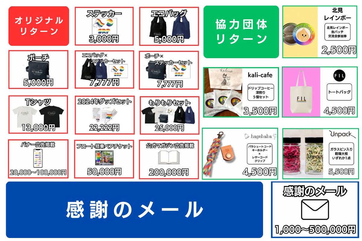 2025/05/02 09:00クラファン終了!まずはご支援そして応援してくださったみなさま、本当にありがとうございました。みなさまのおかげで1,782,613円ものご支援をいただきました!今回クラファンの目標達成には至りませんでしたが、この一か月間、リターン品を提供してくれた団体、広報に協力してくださった方、そして支援してくださったみなさまの想いを確かに、受け取ることができました。今年、札幌で行うパレードは25回目の節目となります。みなさまにいただいた支援を活用させて頂き、いつも以上に楽しんでいただけるパレードにしていきたいと思っています。開催当日まで実行委員一同、一生懸命準備を進めていきます!改めて気持ちを引き締め、今年9月13日・14日のさっぽろレインボープライドの成功に向けて頑張ります。ご支援いただいた方で郵送物がある方へは、これから心を込めて一つ一つ発送する作業を行います。到着まで今しばらくお待ちください。引き続き私たちの活動を見守っていただけますと幸いです!これからもよろしくお願いします!この度は本当にありがとうございました!!(実行委員一同) もっと見る