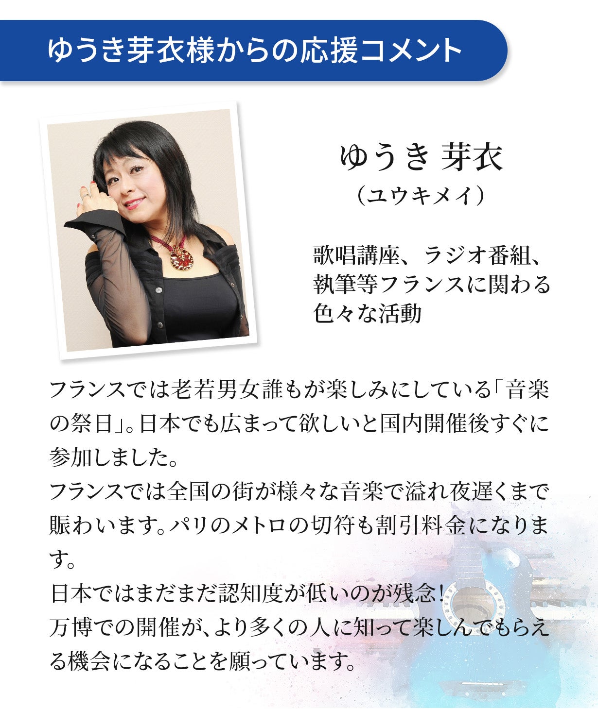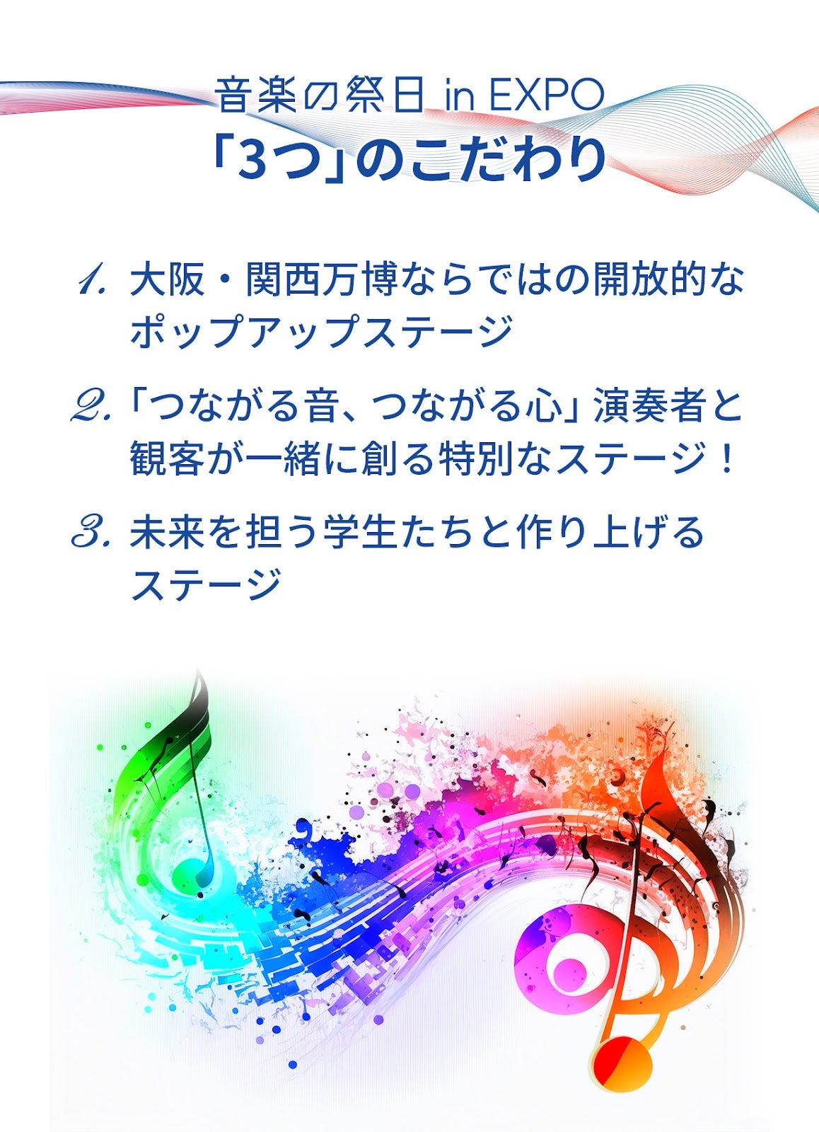 2025年「音楽の祭日 in EXPO」は、たんなる音楽イベントではなく、音楽を通じて世界の多様な文化が交わり、ともに歌い、ともに感じることで、新しい未来を創る第一歩となると信じています。