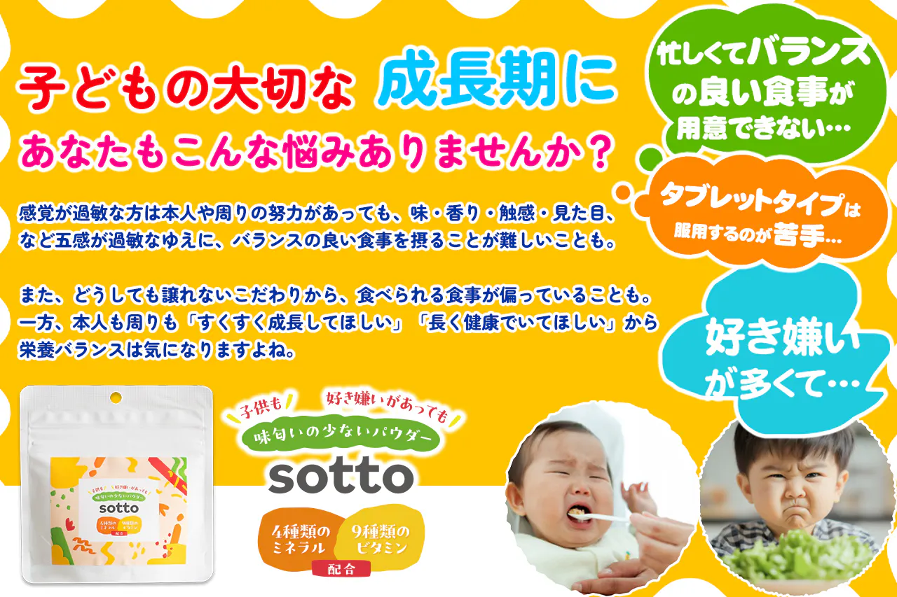 偏食に悩むお子さんとご家族のために、「味・匂いに敏感でも、しっかり栄養をとれるサプリ」 を開発しました。