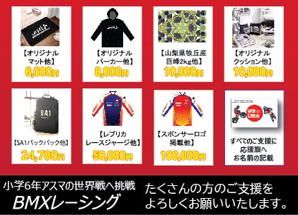 返礼品を数多く用意しました。ただの資金集めに留まらず、BMXレースを知っていただきたい、実際に見ていただきたいと言う思いから、オリジナルグッズを製作いたしました。正直、仕入れに経費が掛かり手元に残るのはわずかかもしれませんが、皆さんの応援を力に変えていきたいと思います。みなさん応援をどうぞよろしくお願いします!みなさんの想いを背負い、一緒にデンマークへ行きましょう!!また、拡散シェアのご協力をお願いいたします。