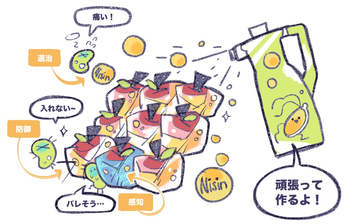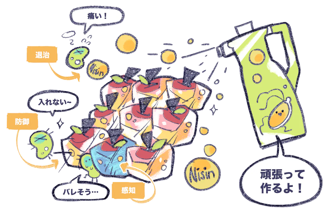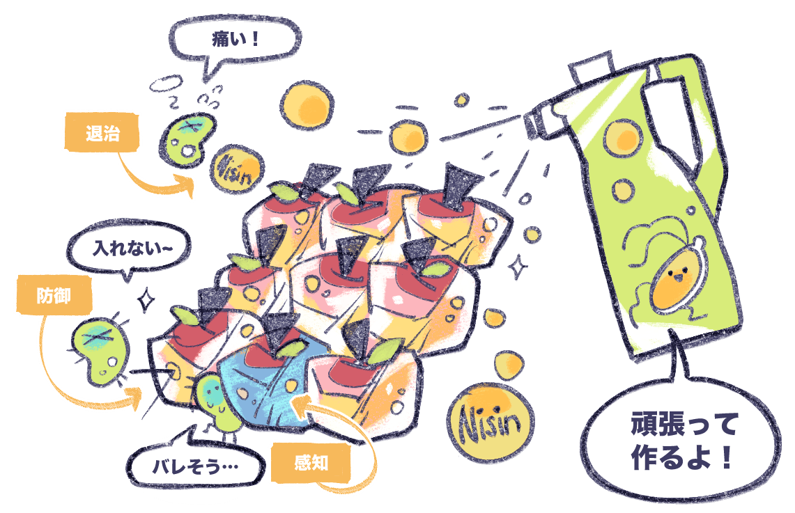 【2】スプレーに“抗菌”と“センサー”機能を持たせるには?私たちは、BC とは別の専用大腸菌株に対して、2 つの異なる機能を付与する予定です。▶ 抗菌機能(ナイシンの生産)ナイシン(Nisin)は、グラム陽性菌に対して高い抗菌活性を持つ天然のバクテリオシンです。本来は乳酸菌(Lactococcus lactis)が生産する物質ですが、そのナイシン生合成遺伝子群を大腸菌に導入します。結果として、大腸菌がスプレー可能な抗菌物質を自ら生産できるようになります。▶ センサー機能(腐敗の可視化)食品の腐敗に伴って発生する特定のガス(例:エチレン)や pH の変化を検出するため、環境応答型プロモーター+色素生成遺伝子を組み込んだセンサー回路を構築する予定です。大腸菌が腐敗に反応して“色”を変えることで、目に見える劣化の兆候をユーザーに知らせます。