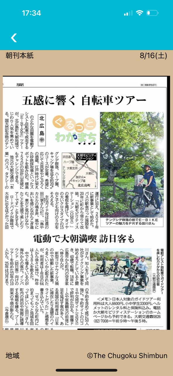 当社(大朝交通)で手掛けるE-BIKEツアーが中国新聞で紹介されました。