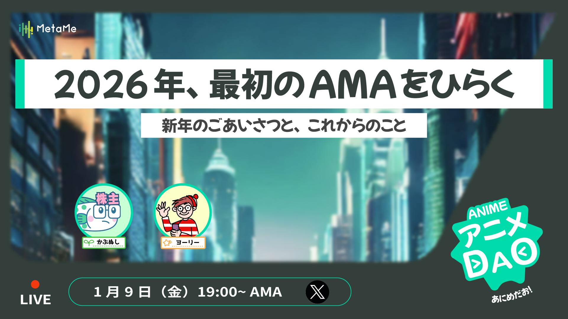 2026/01/07 18:00あけましておめでとうございます!アニメDAOファウンダーの「かぶぬし」でございます。今年も、アニメDAOをよろしくお願いします!ちなみに、私は年末も年始もずっと、制作中のショートアニメに関する作業に明け暮れておりました。着々と進んでおりますので、ぜひお楽しみに!では、今週のお知らせをお届けします。■今週もやります!アニメDAO AMA 毎週金曜日19時から30分配信しているアニメDAOのAMA! 第35回目の配信を今週(1月9日)も実施します。 今週のトピックスは ・声優オーディション最終結果発表! ・1月以降のアニメDAOコミュニティ企画について ・ヨーリーによるおすすめのアニメコーナー をお送りする予定です。 視聴は以下のいずれかでどうぞ♪ ・MetaMe生放送(メタバース配信会場):https://www.metame.ne.jp/event/live5?guest=true ・MetaMe公式X:https://x.com/MetaMe_Official ※どちらも、18時50分以降にお入りくださいなお、前回までのアーカイブはこちらからご覧いただけます。https://youtube.com/playlist?list=PLtoTGXH84sXLs81sow8drd21WroJAUmHm&si=SSw3JT-yTXiWy5WY■アニメDAOコミュニティについて アニメDAOのdiscordも気づいたら250名近い大所帯になってきました。 最近は、コミュニティ内でゲーム企画をしたり、まったりと雑談をしたりと、ゆるりと盛り上がっております。 読み専も大歓迎です。お気軽にご参加くださいね https://discord.gg/metame-animedao もっと見る