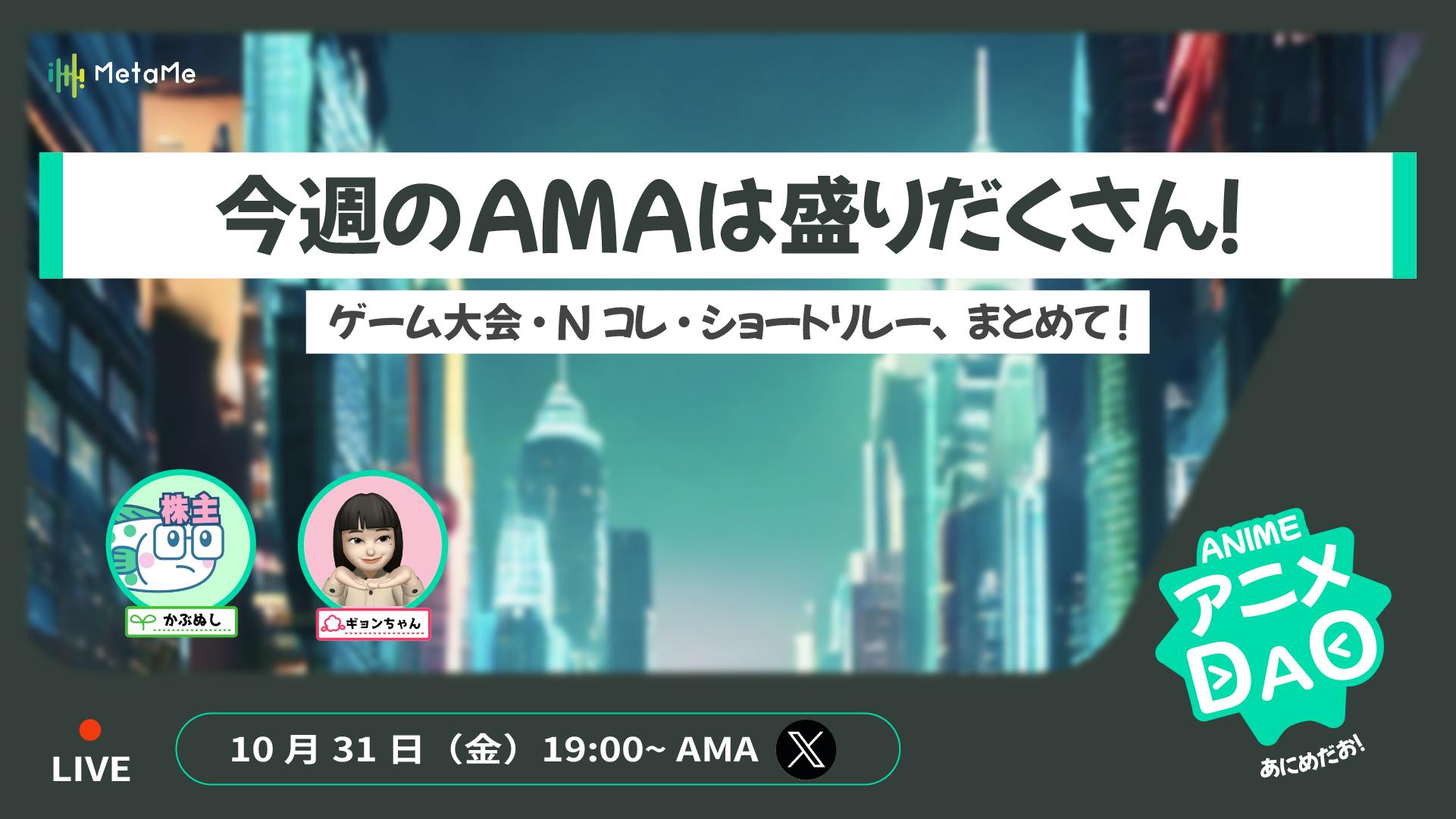 アニメDAOファウンダーの「かぶぬし」でございます。今週のお知らせをお届けします^^■今週もやります! アニメDAOのAMA 毎週金曜日19時から30分配信しているアニメDAOのAMA! 第26回目の配信を今週も実施します。 今週のトピックスは  ・eスポーツ大会「GT6551」を終えて  ・DAOくんリレーアニメ「第1話」投票結果について  ・動画生成AIを活用した動画作成方法について  ・動画生成AIについてのディスカッション  ・ショートアニメ進捗状況チラ見せ?と声優問題について  ・11月1日〜のNコレについて などをお送りする予定です。  視聴は以下のいずれかでどうぞ♪ ぜひ「アニメDAOアバターTシャツ」を着てメタバース会場においで下さい!  ・MetaMe生放送(メタバース配信会場):https://www.metame.ne.jp/event/live?guest=true  ・MetaMe公式X:https://x.com/MetaMe_Official  ※どちらも、18時50分以降にお入りくださいなお、前回までのアーカイブはこちらからご覧いただけます。https://youtube.com/playlist?list=PLtoTGXH84sXLs81sow8drd21WroJAUmHm&si=SSw3JT-yTXiWy5WY■クラウドファンディングリターンについて 「はじめてのNFTコース」をご支援下さったみなさまに、NFTのエアドロを完了しました!  NFTは現在もMetaMe NFTマーケットプレイスから購入可能ですので、ぜひご検討くださいね♪  https://nft.metame.ne.jp/ja/group/lyrica6551-2■アニメDAOコミュニティについて アニメDAOのdiscordも盛り上がっております! 読み専も大歓迎です。お気軽にご参加くださいね https://discord.gg/metame-animedao