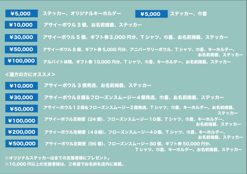 2)¥10,000以上のご支援者様:お名前を一覧にして福岡店に掲載し設置(希望者のみ)