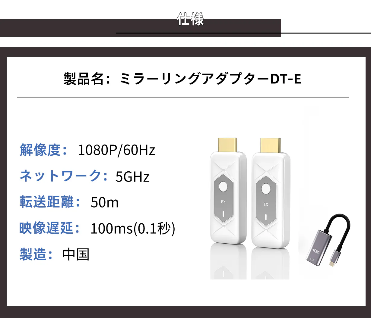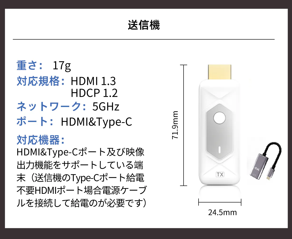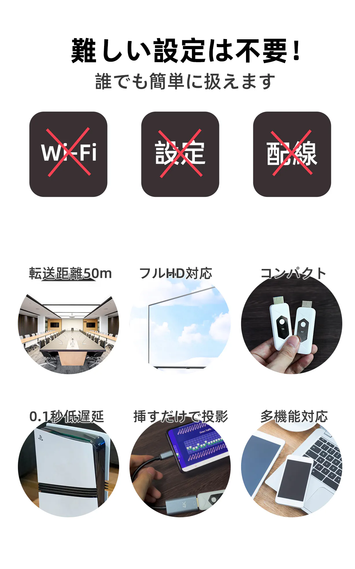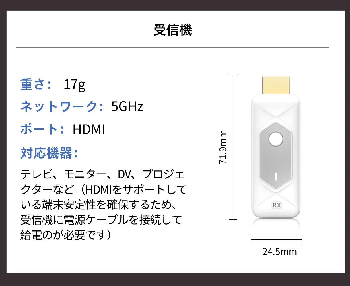 本製品を輸入しようと考えた理由は、ビジネスシーンや家庭において「ケーブル接続の煩わしさをなくしたい」というニーズが年々高まっているためです。特に会議室・教室・自宅のテレビなど、誰でも簡単にワイヤレスで映せる環境を求める声は多くあります。本製品は最大50mの安定した伝送距離を実現しており、接続操作もシンプルで、機器に詳しくない方でもすぐ使えるという利便性があります。大がかりな設定やWi-Fi環境が不要で、差し込むだけで画面共有できる点は、多くのユーザーにとって大きなメリットになると思います。