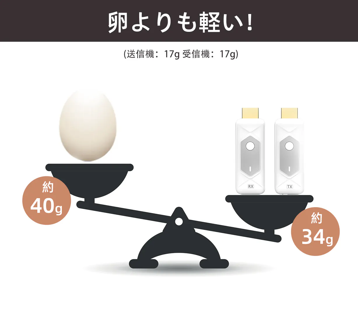 送信機・受信機ともに17gずつで、2つ合わせてもたったの34g。バッグに入れても気にならない、軽さが魅力です。