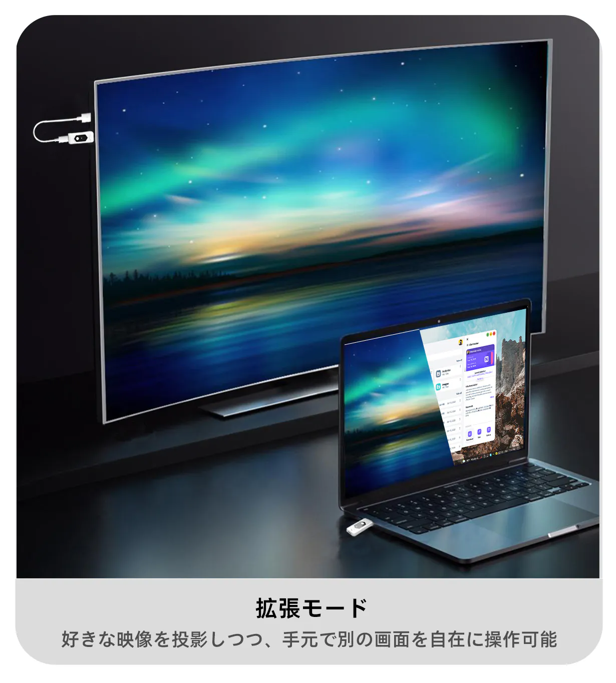 拡張モードでは、投影先のテレビやプロジェクターには別の画面を表示しつつ、手元のパソコン画面は独立して操作できます。ビジネスでは、大画面に資料やプレゼンを表示しながら、自分のパソコンでメモを取ったり次の資料を準備したり可能です。プライベートでは、映画や動画を大画面で楽しみながら、手元のパソコンでチャットやブラウジング、ゲームの攻略情報を確認するなど、マルチタスクにも最適です。