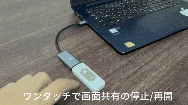 画面共有の一時停止もボタンひとつで簡単操作!送信機のボタンを押すだけで映像を一時的にオフにでき、再開も同じボタンでスムーズに。シンプル操作だから、会議中でも待たせず素早く一時停止・再開が可能です。