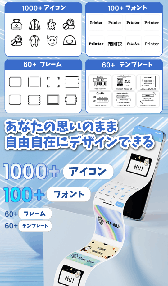 誰でも使える!スマホアプリで超カンタン操作 直感的なデザインで、ラベル作成初心者でも安心。 フォント、アイコン、フレームもアプリで自由に選べます。