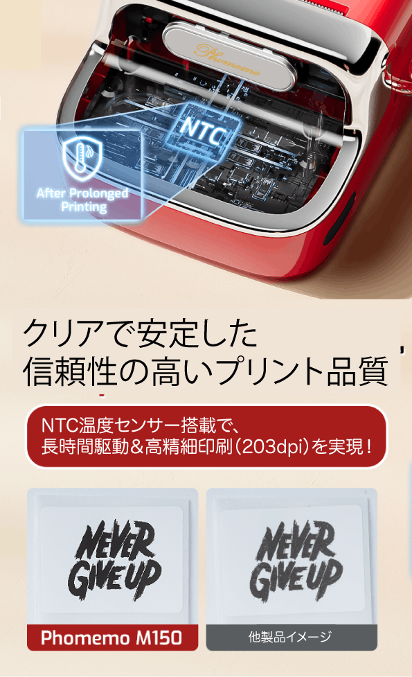 高解像度203dpiで、文字もイラストもくっきりキレイ 細かい文字も潰れない!高解像度で読みやすく、美しくプリント。また、NTCサーマルセンサー搭載で温度制御を行い、長時間での印刷品質を維持します。