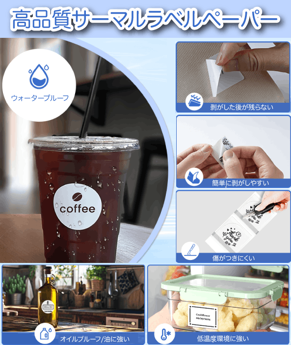 いろいろな使用用途を考えて、高品質なラベル紙をご用意しています。キッチンやバスルームで使えるような水対策、油対策、さまざまな悪環境に耐えられる傷への耐性も考えられています。また、低温度環境にも強く、冷蔵庫の中で使うコンテナなどに貼っても、問題なくつかえます。