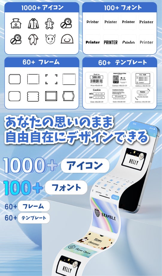 誰でも使える!スマホアプリで超カンタン操作 直感的なデザインで、ラベル作成初心者でも安心。 フォント、アイコン、フレームもアプリで自由に選べます。