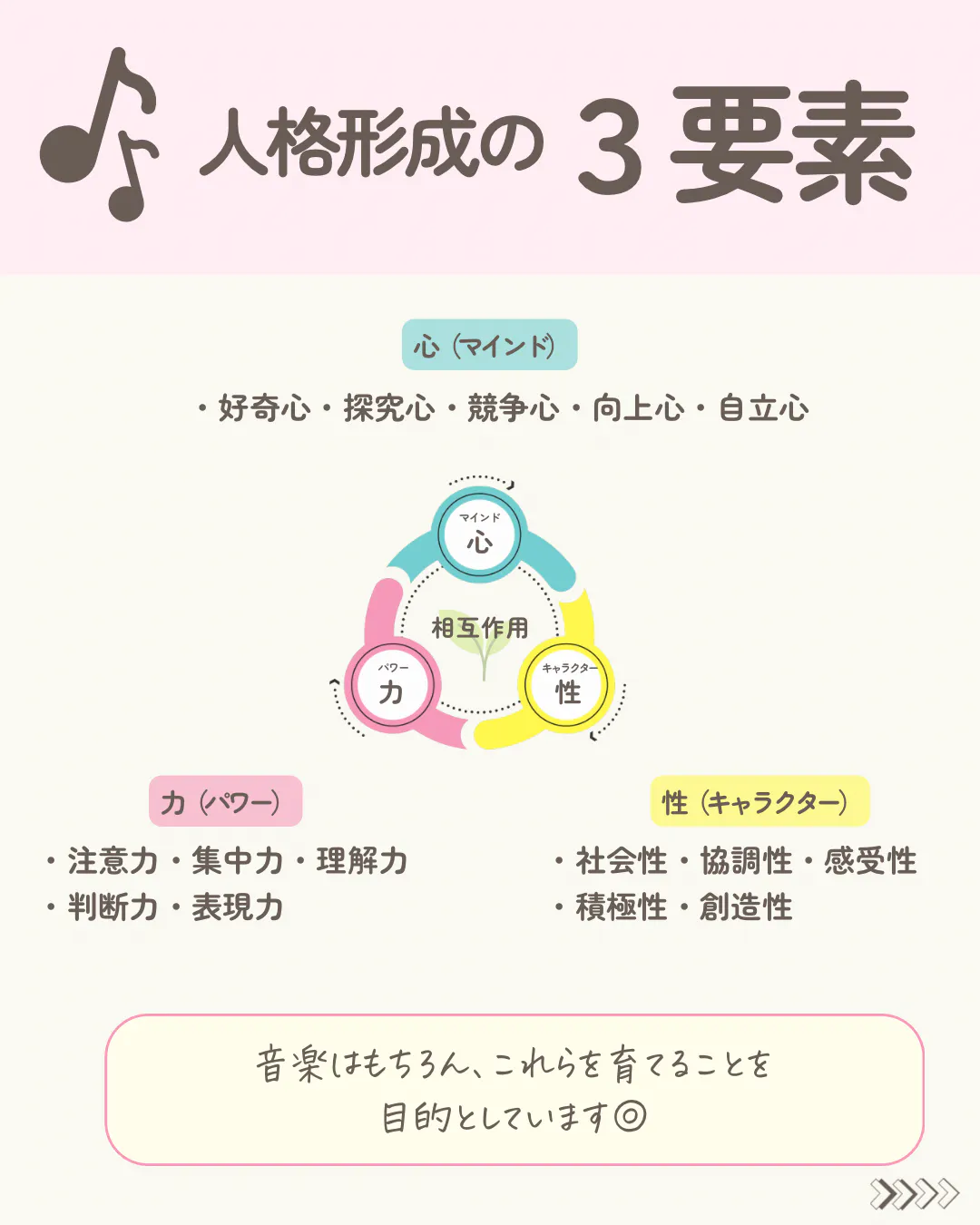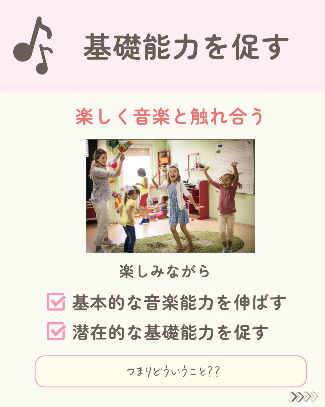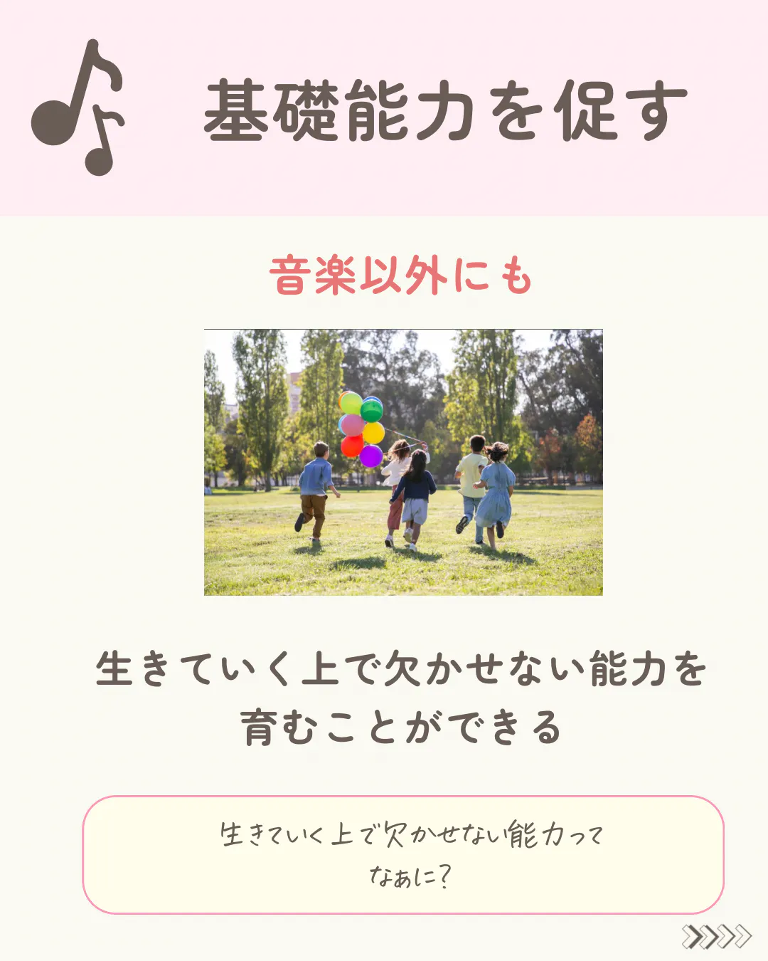 リトミックを通して、現在世界的に注目されている"非認知能力"を育むことの大切さを実感しています。