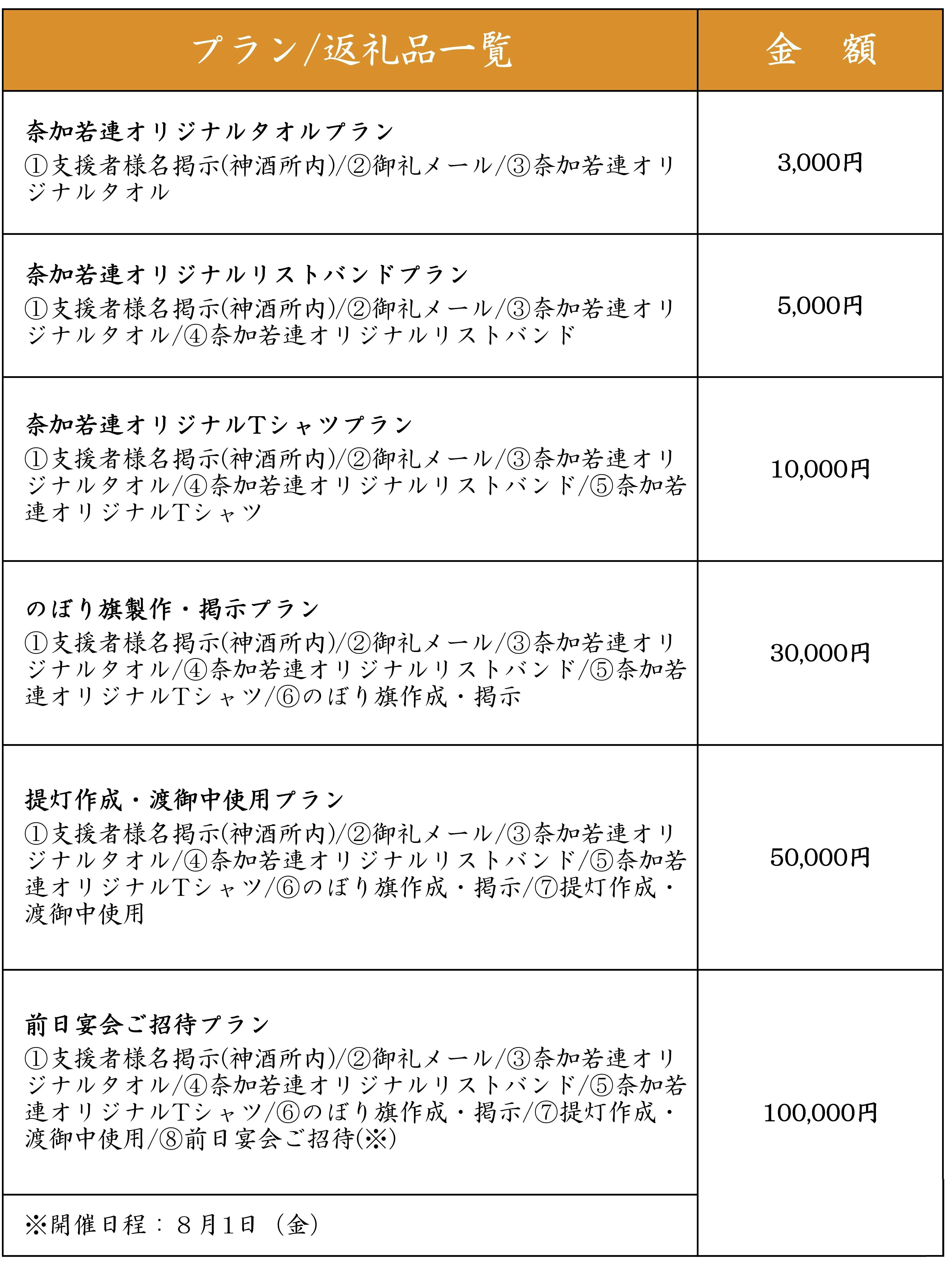 ご支援いただいた皆様へのリターンにつきましては、私たち「奈加若連」にしかできない、神輿渡御に関連した以下のようなものをご用意しました。