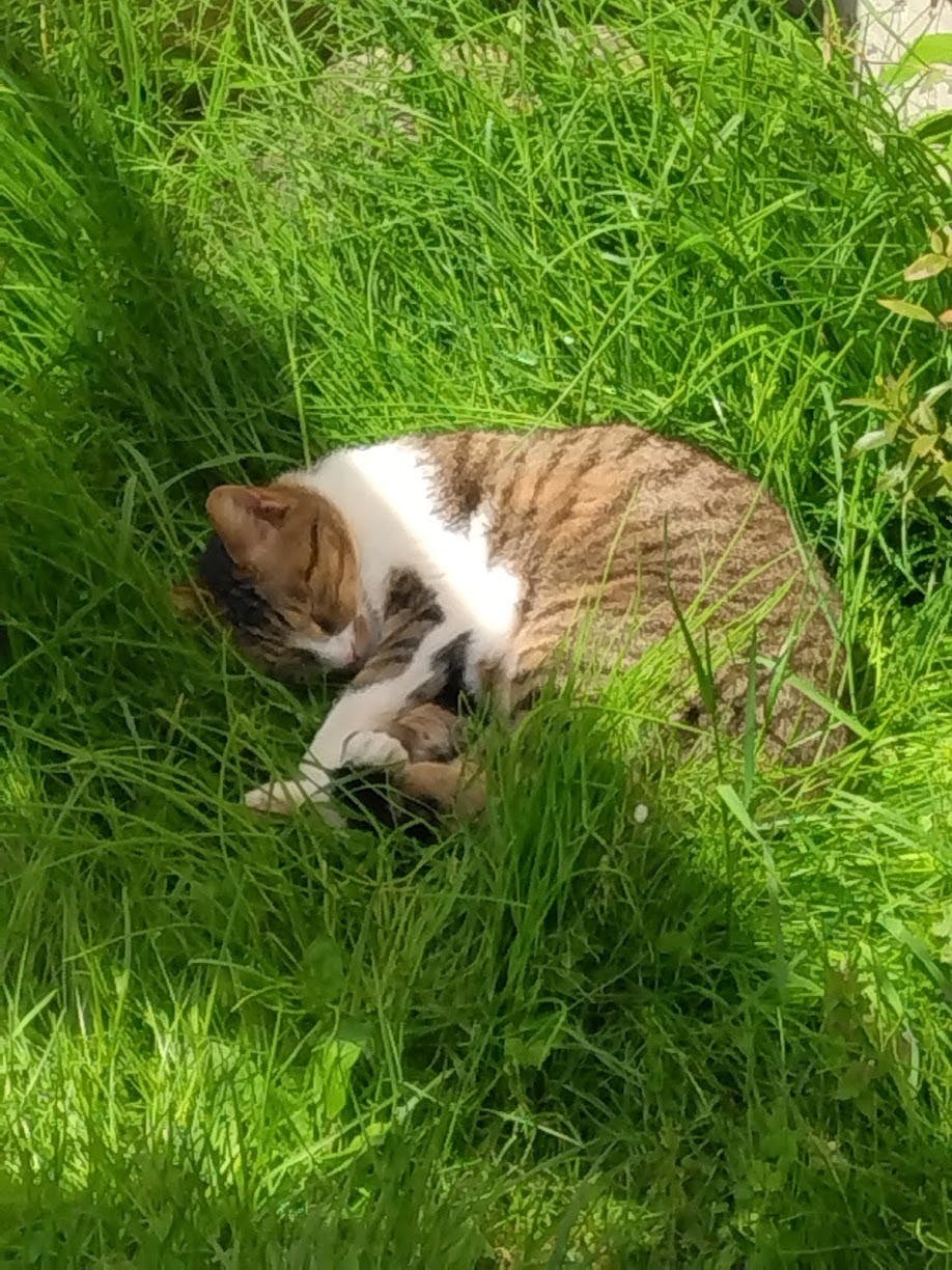 2025/05/05 11:29我が家にいる保護猫は、餌は食べるためには近寄ってはくれますが、決して体には触らせてくれません。頭なでなでとか、まずできません(泣)ちょっと近づくと、するっと逃げてしまいます。それなのによく去勢できたものだと思いますが、そこは、熟練の技!捕獲技術というか、結構な回数の捕獲回数で、慣れを身につけたのかもしれません。今回の写真は、我が家のアサツキ畑をベッドに寝転ぶ一番最近去勢手術をした若いメス猫ちゃんです。すんごくかわいいので、シャッターチャンスだと思って、撮りました。猫たちが幸せそうだと、癒されるし、何よりも、ありがたい。苦労した甲斐があります。近寄ると、起きて逃げてしまうので、一定距離をおいてシャッターを押しています。切ない話もたくさんあるけれど、やっぱり、小さくてもほっとできる幸せ、ほしいですよね。だからこそ、明日も頑張ろうと思えます。きっとこの子にとっても、今は一番の幸せだと思います。明日も、この子たちにとって、幸せと思える日がありますように。 もっと見る