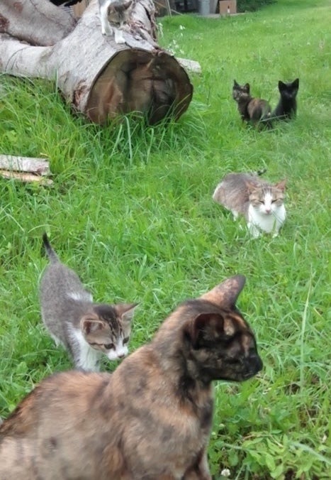 2025/05/12 19:55みなさま、本当にありがとうございました!あと4時間で募集は終わりますが、最後に猫たちの近影の紹介をさせていただきたいと思います。昼下がりのお庭に、ようやく緊張がとけた猫たちがわらわらと遊びだしました。いちばん中央にいる猫がお母さん猫で、それ以外は全部その子供たちです。かわいいでしょ?我が家を選んでしまった以上はしょうがありません!見捨てられません!全部に去勢手術をしていく予定です。現在、去勢手術1匹分と半年分の餌代に相当する寄付が集まりました。本当に感謝です。(全然関係ありませんが、写真に写っている大きな切り株は冬に積雪の重みで道路に倒れた木を、土木会社の方が好意で置いていったものです。我が家の薪風呂の薪にしていく予定ですが、現在はまだ猫のとぎ台&遊び台になっています。自然との共生はなかなか過酷です。)寄付をいただいた方からのメッセージで捨てて「いい場所」なんてない。というものが、ありました。本当にその通りだと思います。猫たちにとっての幸せ、それは遠からず人間の幸せにもつながるような気がします。どうか少しでも、猫たちが幸せに生きられますように。どうか私たちに、猫たちを幸せにできる余力が残っていますように。心から願って、最後の投稿にしたいと思います。ご覧いただき、ありがとうございました!どうか、みなさまが健やかで、幸せな日々をおくれますように。 もっと見る