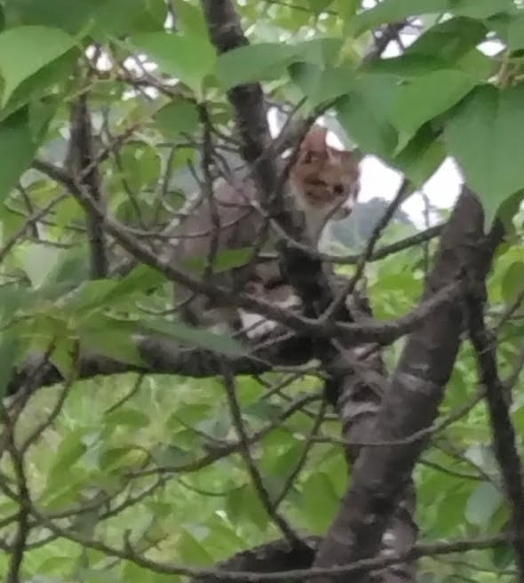 木の上に登っていました!子猫って自力では降りられないのですよね。