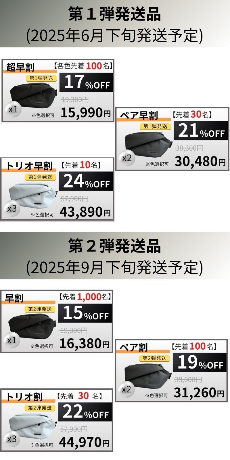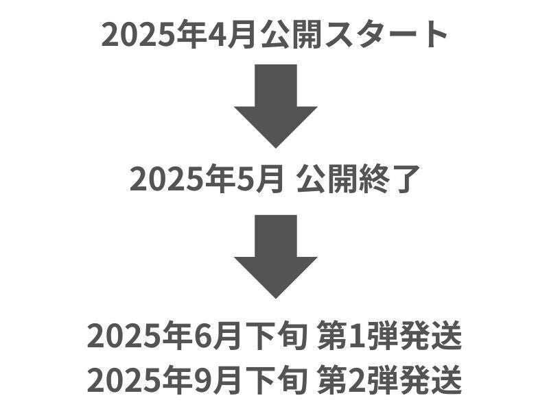 プロジェクト公開後の生産となりますので、第一弾が2025年6月下旬、第二弾が9月下旬の発送お届けを予定しています。
