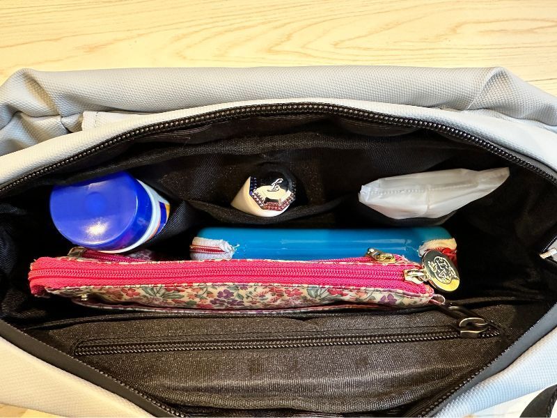 ミラーレスカメラ、ポーチ、メガネ、おやつ、カップラーメンにティッシュBOXまで、大きめの荷物が収納できます。