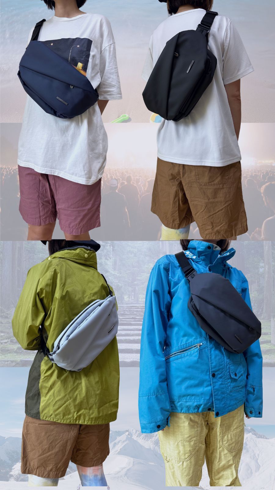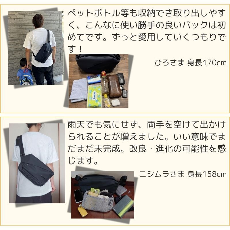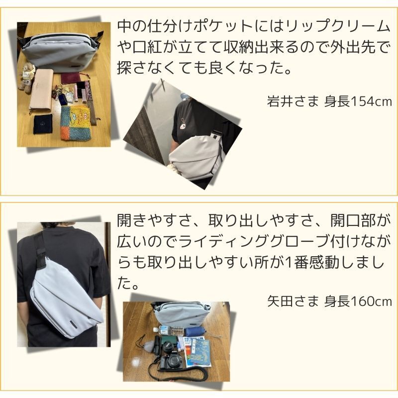 旅行、ウィンタースポーツ、アウトドアスポーツ、フェス、ライブ、スポーツ観戦、散歩、自転車、バイクなどアクティブな趣味がある方におすすめです。また、手荷物が多い方、現在のバッグに物足りなさを感じている方に選ばれています。