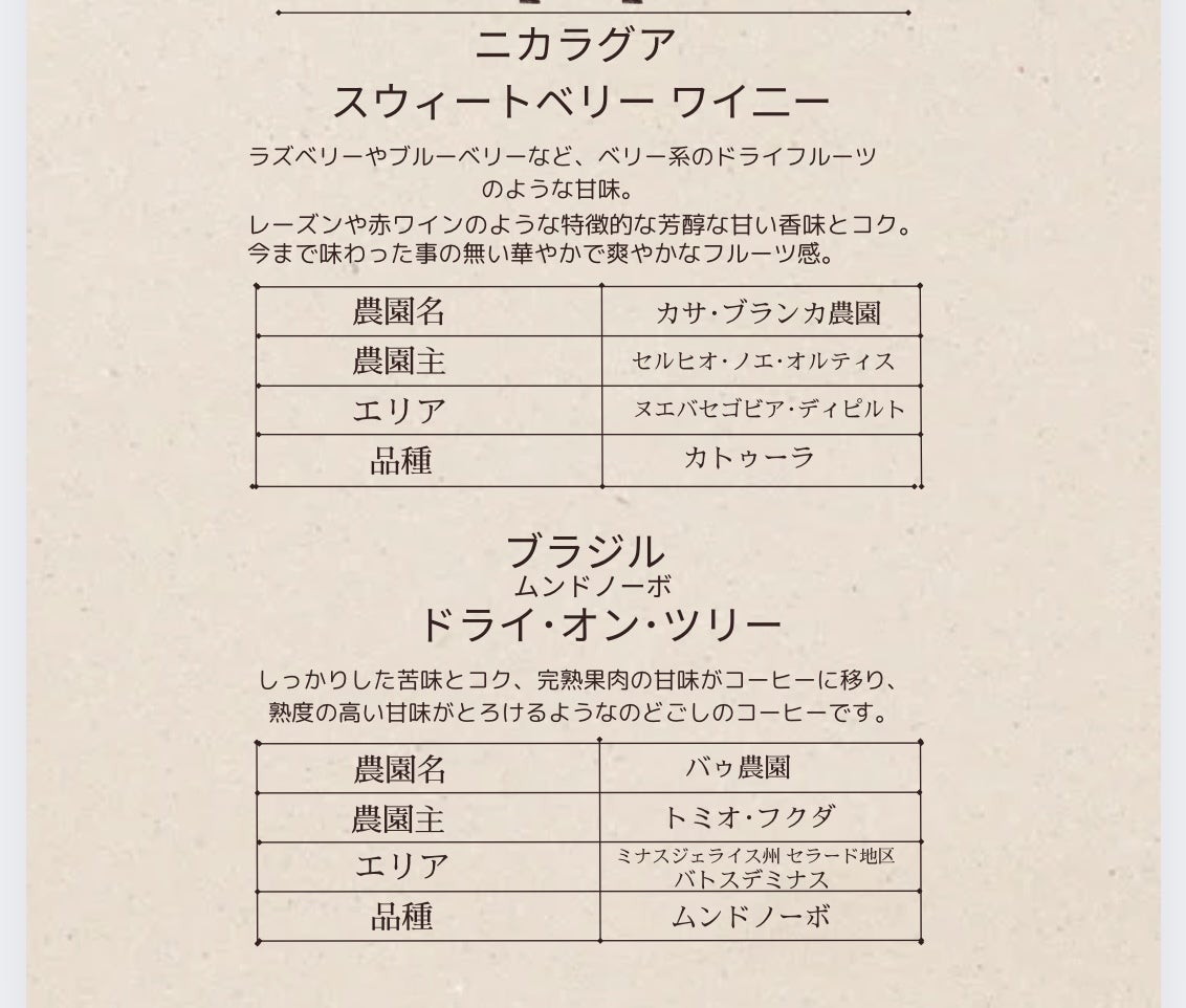 また、珈琲豆も農園名、農園主、エリア、品種とこれらをお客様に分かるようにメニューと共に置いています。お客様自身にも安心して飲んで頂けるようにしています。