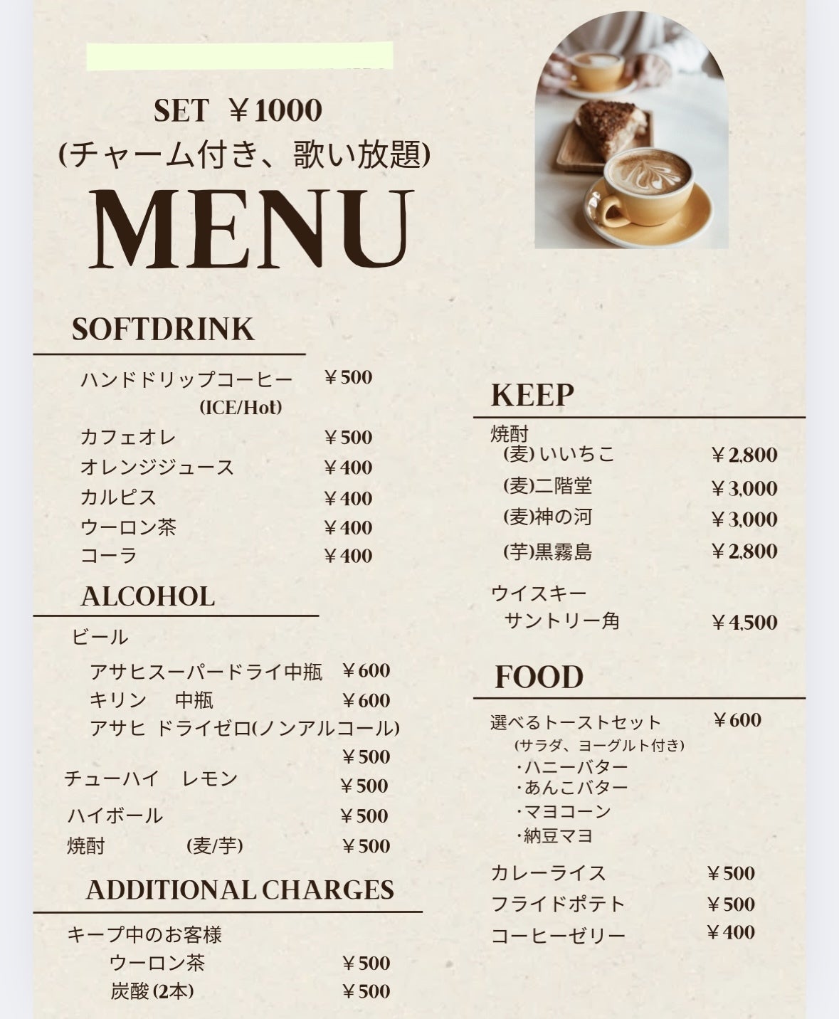 また、カラオケを歌われる方とキープして下さっている方のみセット料金を頂いており、普通のカフェ利用も出来るようにしております!!