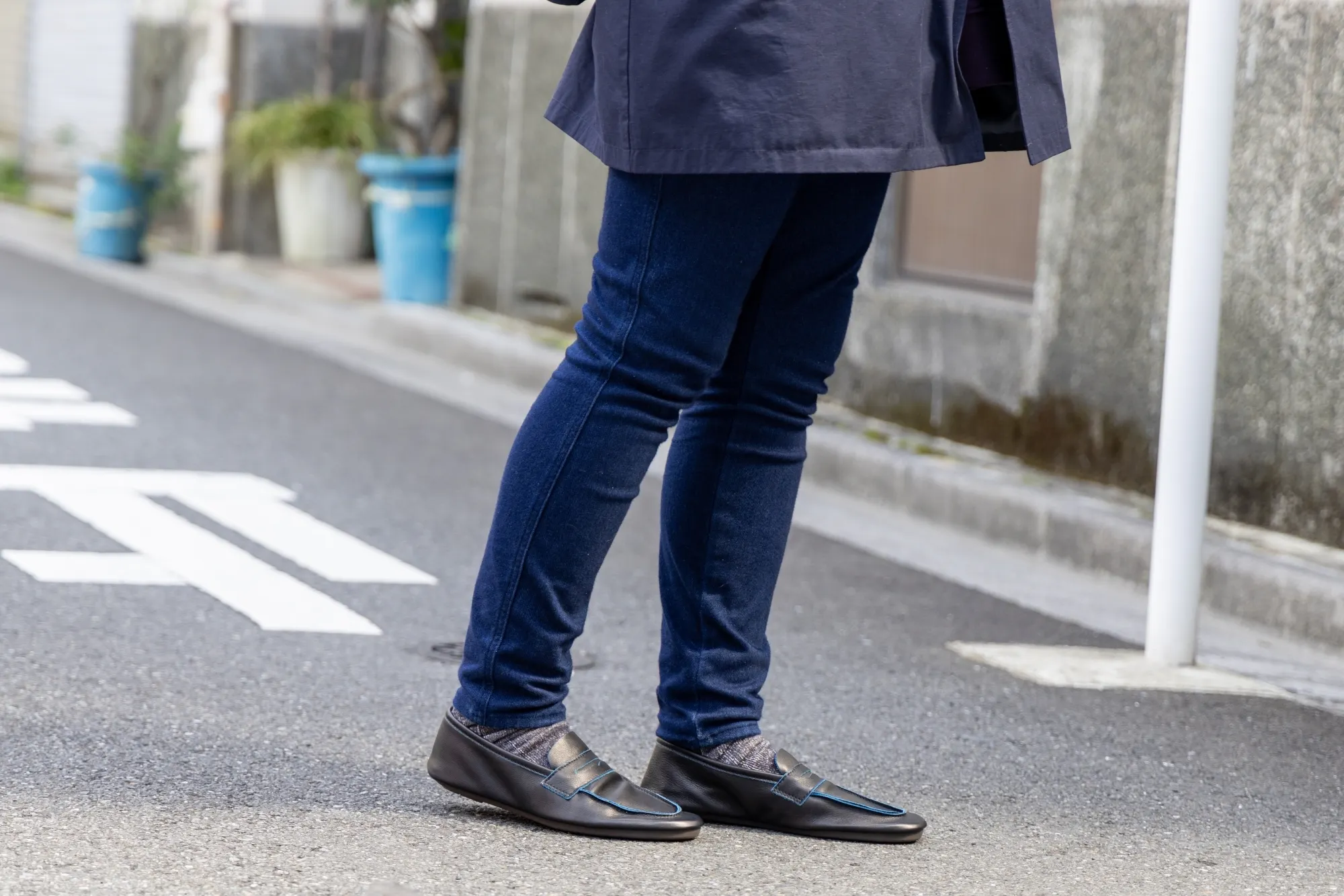 今回は、この「くたローファー」にラスティーカーフを特別採用。ラスティーカーフ特有の柔らかさと上品な艶が、足元に洗練された存在感をもたらします。時間とともに変化する「青の芯」の個性を、履きながら楽しめる唯一無二の一足です。