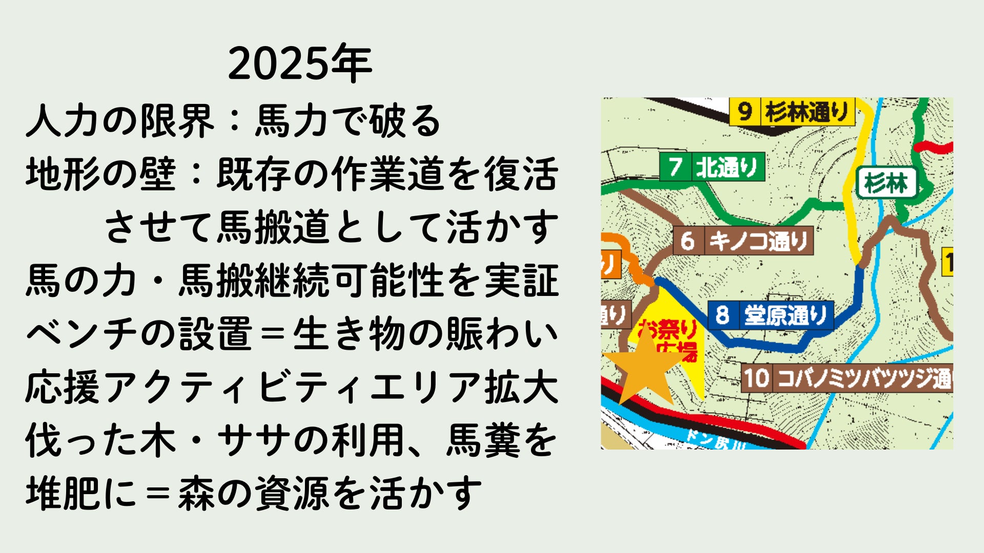 生身の森×生身の馬×生身の人。わくわくするような関わり合いとその作用の循環を五感で感じて、地形の壁、高齢化の壁、資金の壁、できっこない意識の壁を乗り越えて、みんなでわくわく、明るく健全な森をつくる活動を体験していただきたいと思っています!