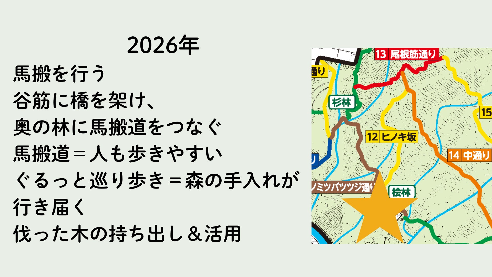 1月~ 広場・馬搬道エリアの整備を開始、ヒノキ・ササの利用法を検討、行政手続き確認