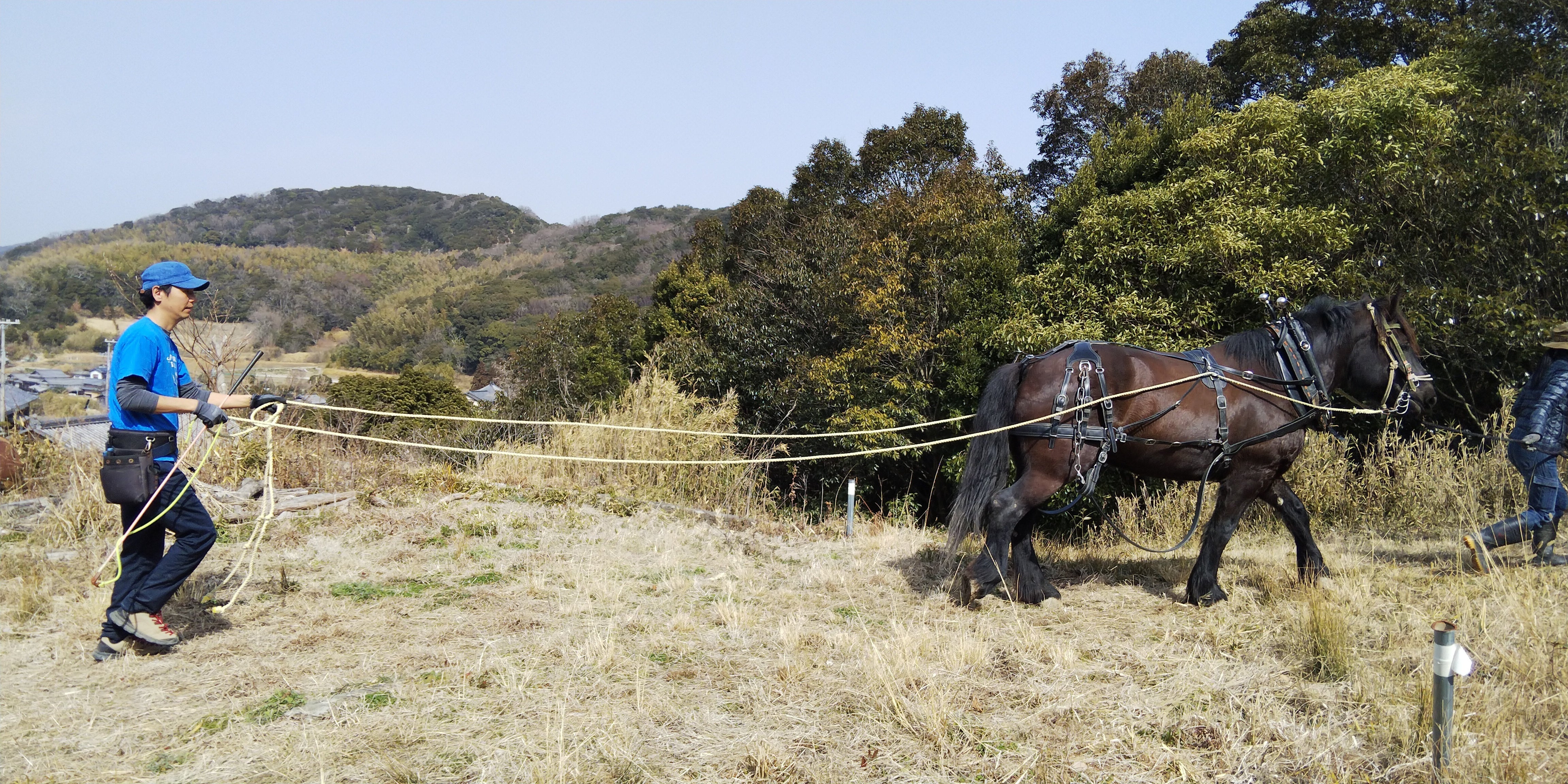 私たちは森で馬を飼っているわけではありません。県内の保護馬牧場シェアホースアイランドさんから農耕馬の「風月号」と牧場主である山下勉さんのチームに出張していただきます。会員もチームに加わり、お手伝いします。