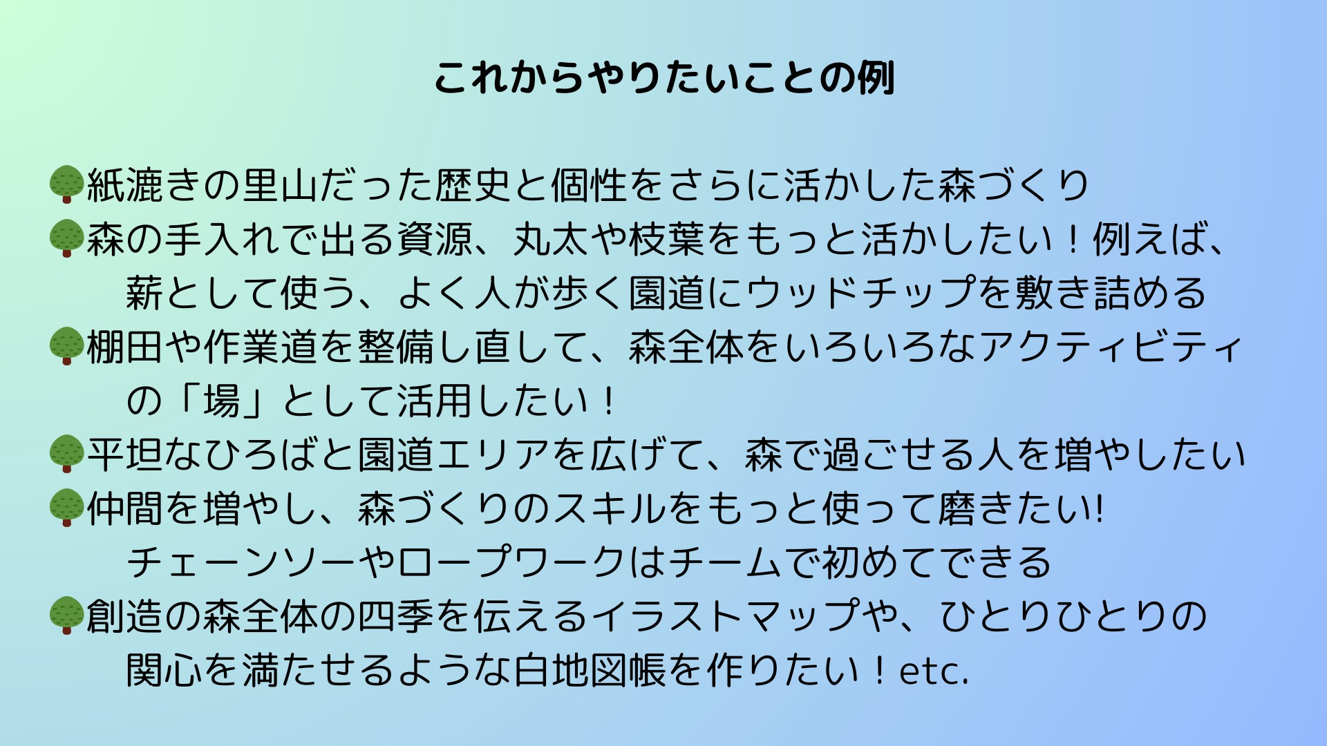 力を貸してくれる人、森づくり活動に加わってくれる”森活人”を増やして、やりがいのある活動アイディアを出し合い、その実現をサポートし合える仲間を増やしたい。