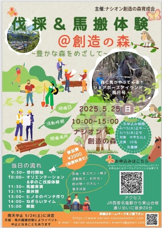 5月25日(日) 『伐採&馬搬体験@創造の森』(10:00~15:00。雨天中止、2026年度に持ち越し)