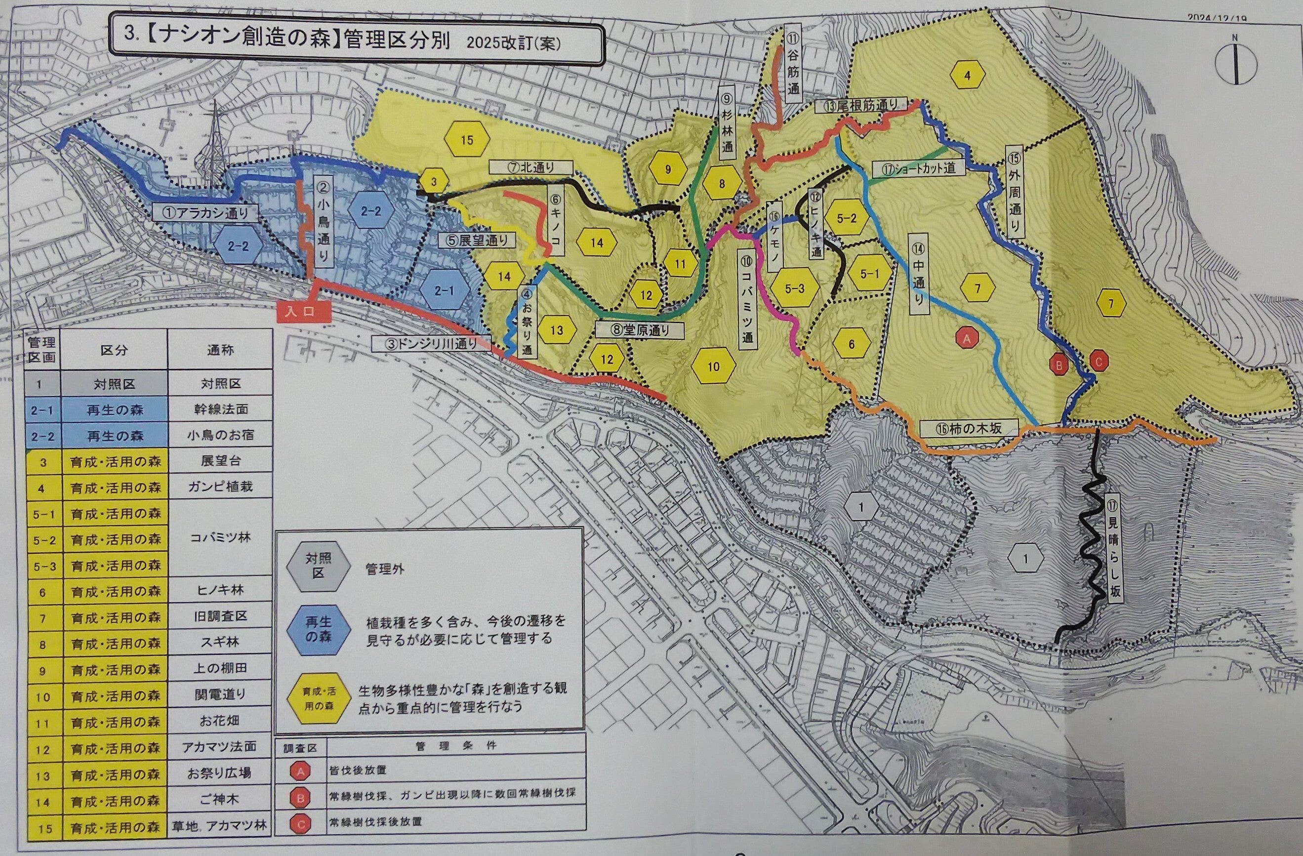 森の今の全体像と森づくり計画全体を誰にでもイメージしてもらいやすくするために、森づくりの区画マップも構成し直し、その区画に親しみやすい名前を付け直しました。